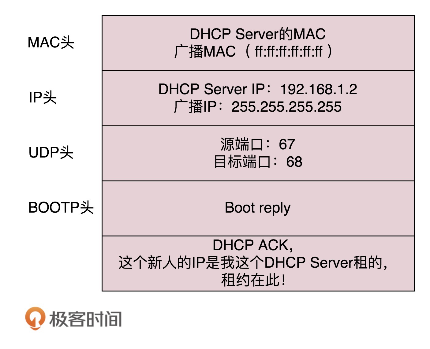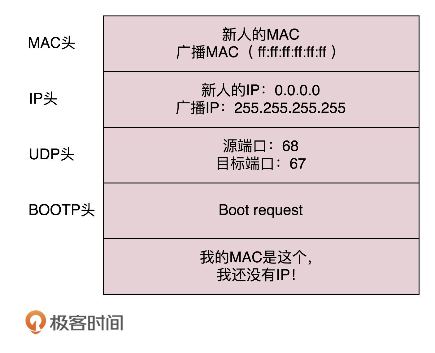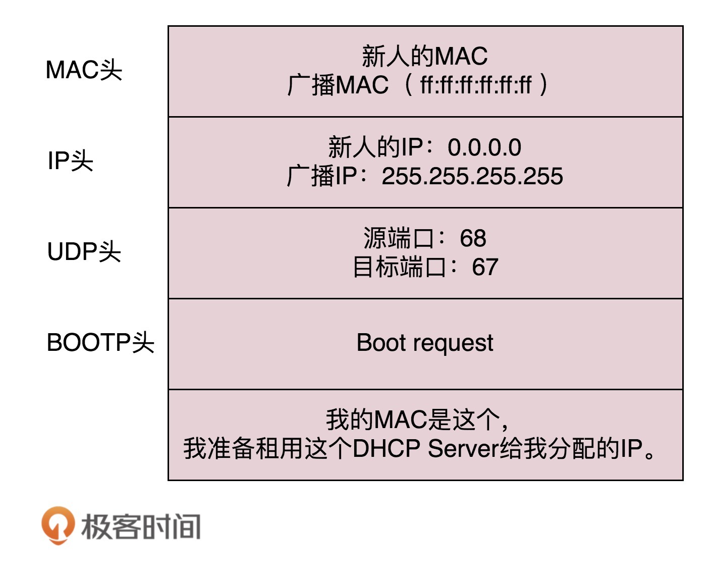新来的机器使用IP地址0.0.0.0发送了一个广播包,目的IP地址为255.255.255.255。广播包封装了UDP,UDP封装了BOOTP。其实DHCP是BOOTP的增强版,但是如果你去抓包的话,很可能看到的名称还是BOOTP协议。