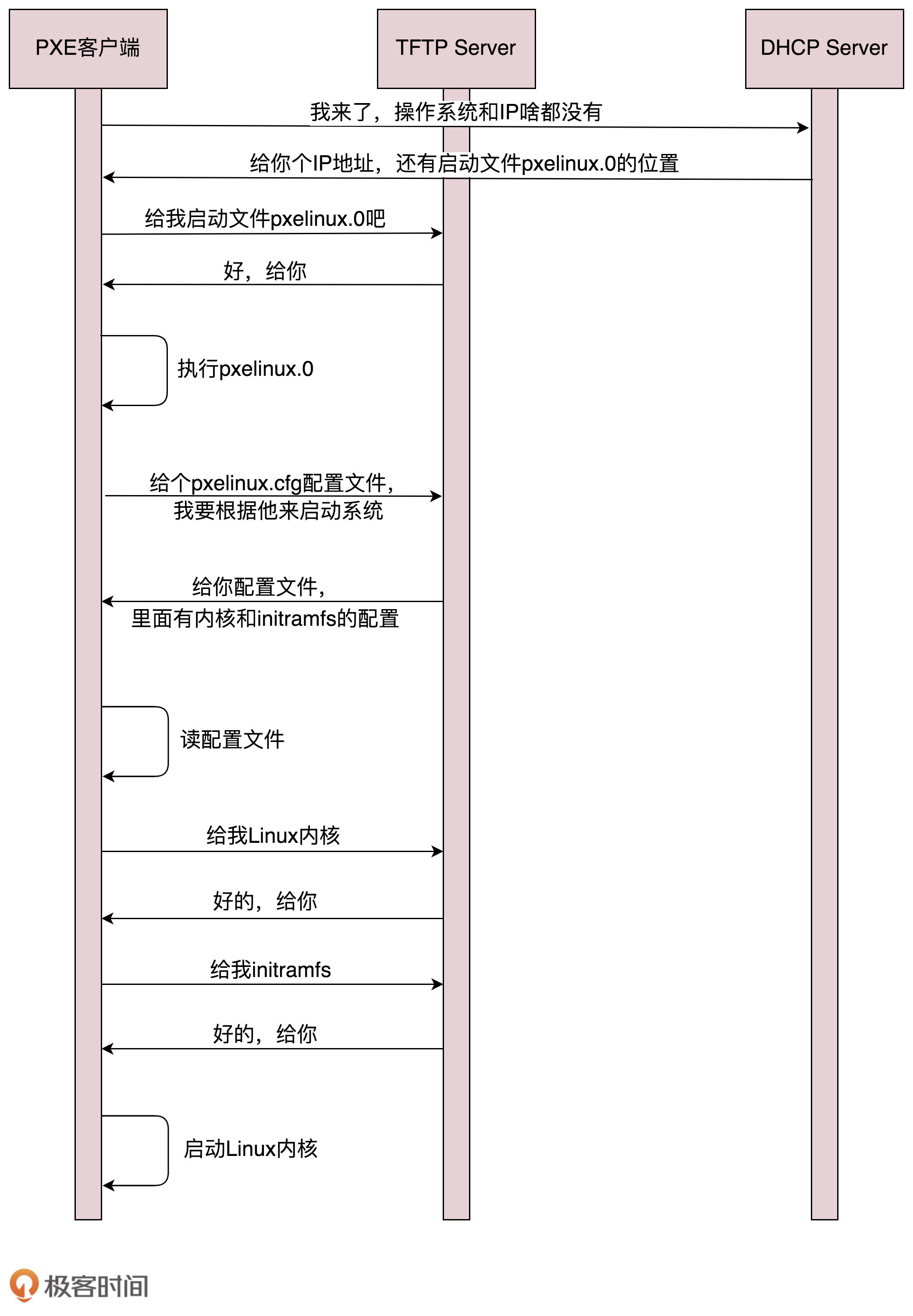 首先,PXE客户端自己也需要有个IP地址。因为PXE的客户端启动起来,就可以发送一个DHCP的请求,让DHCP Server给它分配一个地址。PXE客户端有了自己的地址,那它怎么知道PXE服务器在哪里呢?对于其他的协议,都好办,要有人告诉他。例如,告诉浏览器要访问的IP地址,或者在配置中告诉它;例如,微服务之间的相互调用。