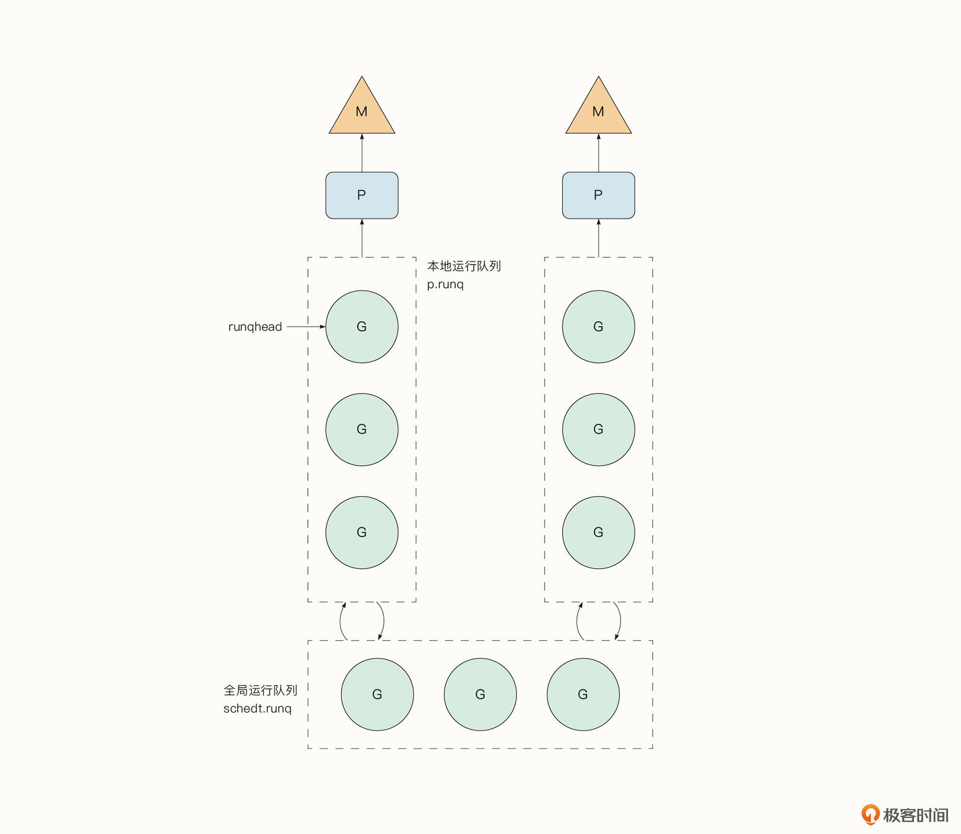 由于程序中不可能同时执行成千上万个协程,因此,那些等待被调度的协程就存储在了运行队列中。