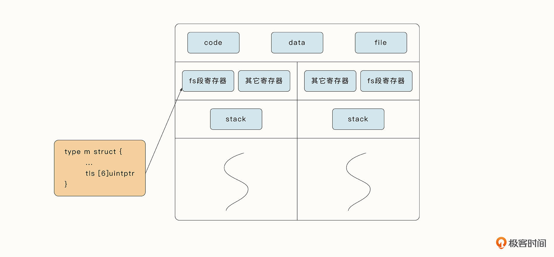 结构体 m要与真实的操作系统线程绑定在一起,这就需要借助线程本地存储技术了。和普通的全局变量对程序中的所有线程可见不同,线程本地存储中的变量只对当前线程可见。因此,这种类型的变量可以看作是线程“私有”的。一般情况下,操作系统会使用FS/GS 段寄存器存储线程本地变量。