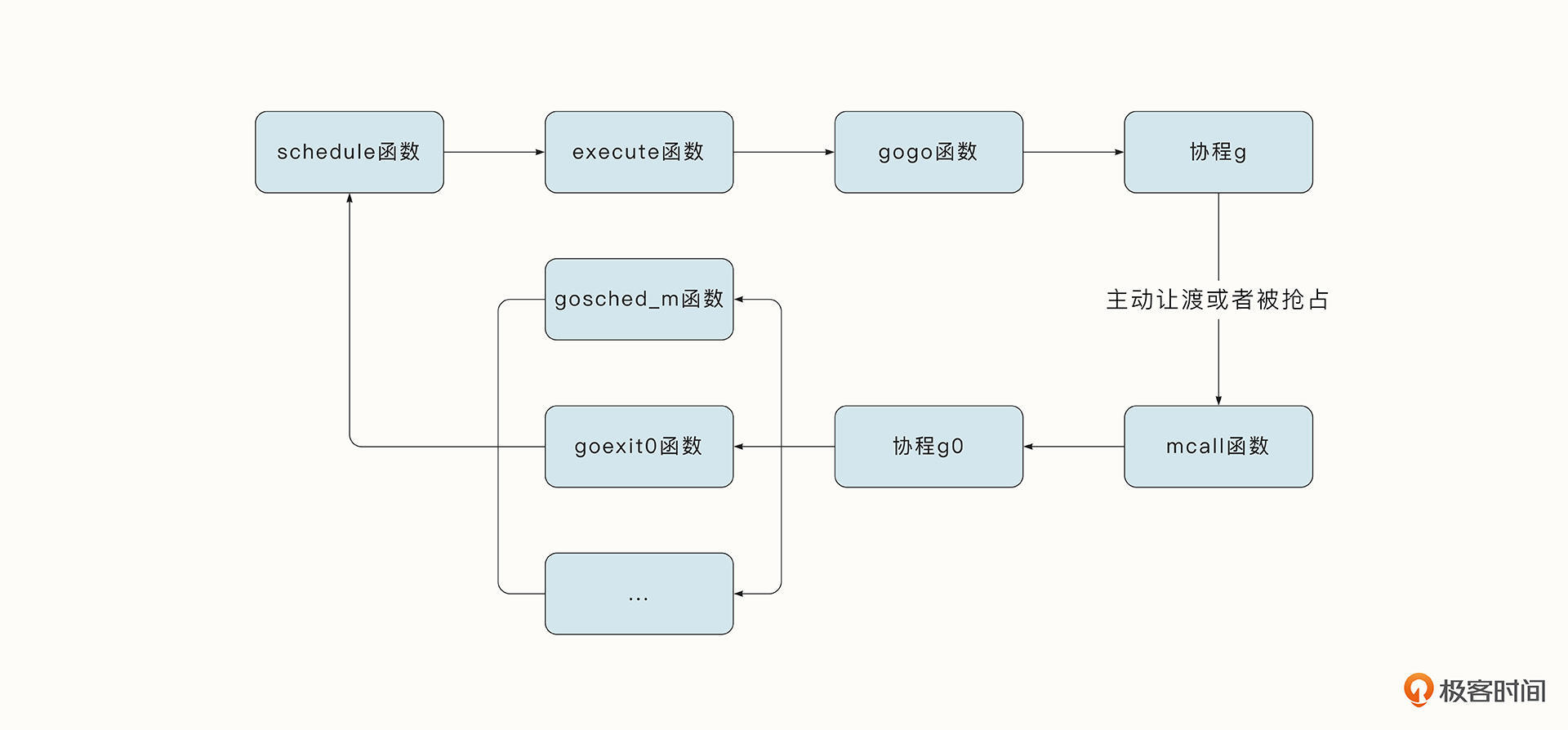 从协程 g0 调度到协程g,经历了从schedule 函数到 execute 函数再到 gogo 函数的过程。其中,schedule 函数处理的是具体的调度策略,也就是选择下一个要执行的协程;execute 函数执行的是一些具体的状态转移、协程g 与结构体m 之间的绑定等操作;gogo函数是与操作系统有关的函数,用于完成栈的切换以及恢复 CPU 寄存器。执行完这一步之后,协程就会切换到协程 g 去执行,当协程 g 主动让渡、被抢占或退出后,又会切换到协程 g0 开始下一轮调度。