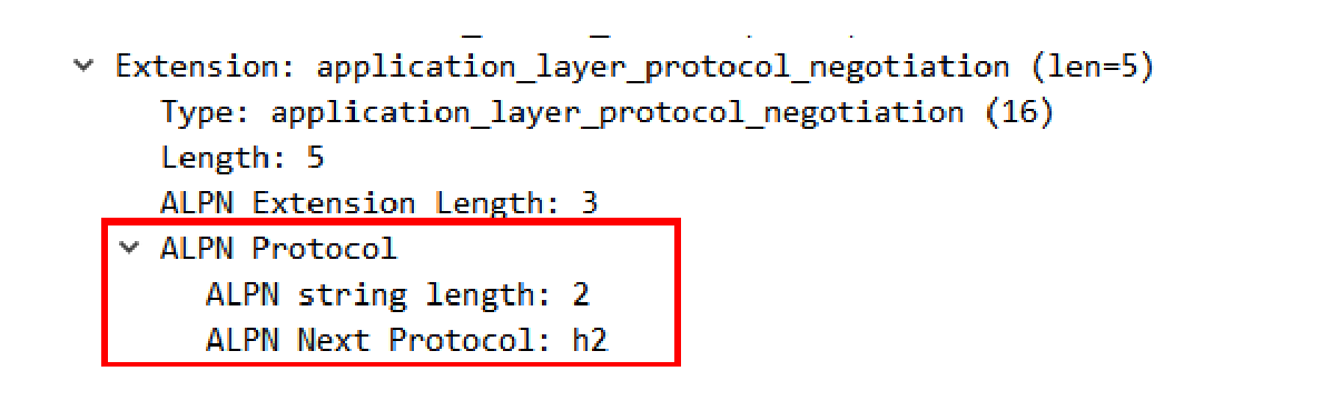 客户端在发起“Client Hello”握手的时候,后面会带上一个“ALPN”扩展,里面按照优先顺序列出客户端支持的应用协议。