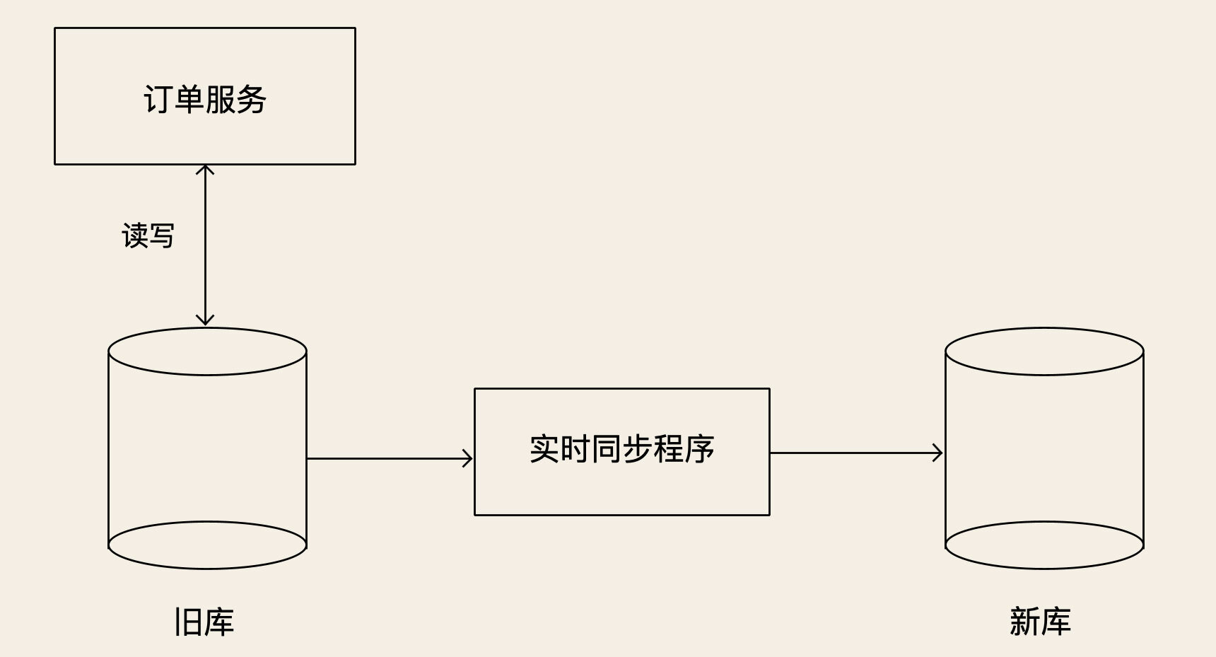 首先要做的就是,把旧库的数据复制到新库中。因为旧库还在服务线上业务,所以不断会有订单数据写入旧库,我们不仅要往新库复制数据,还要保证新旧两个库的数据是实时同步的。所以,我们需要用一个同步程序来实现新旧两个数据库实时同步。