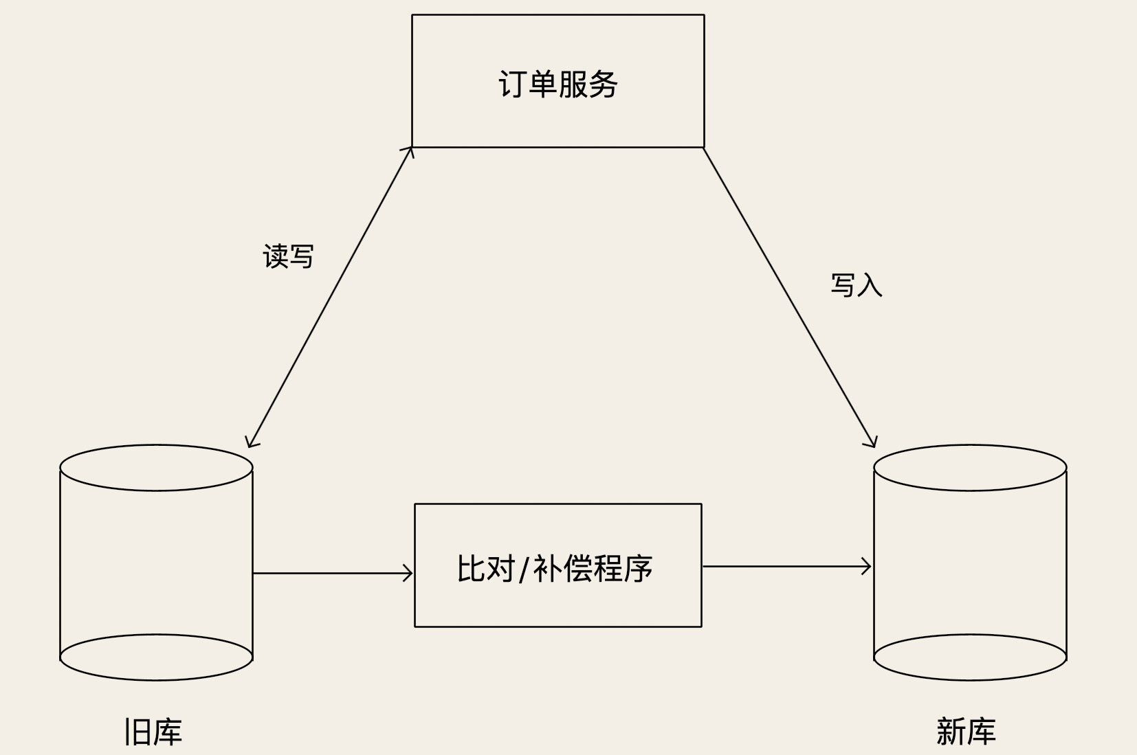 这样,切换双写期间,少量不一致的订单数据,等到订单完成之后,会被补偿程序修正。后续只要不是双写的时候,新库频繁写入失败,就可以保证两个库的数据完全一致。