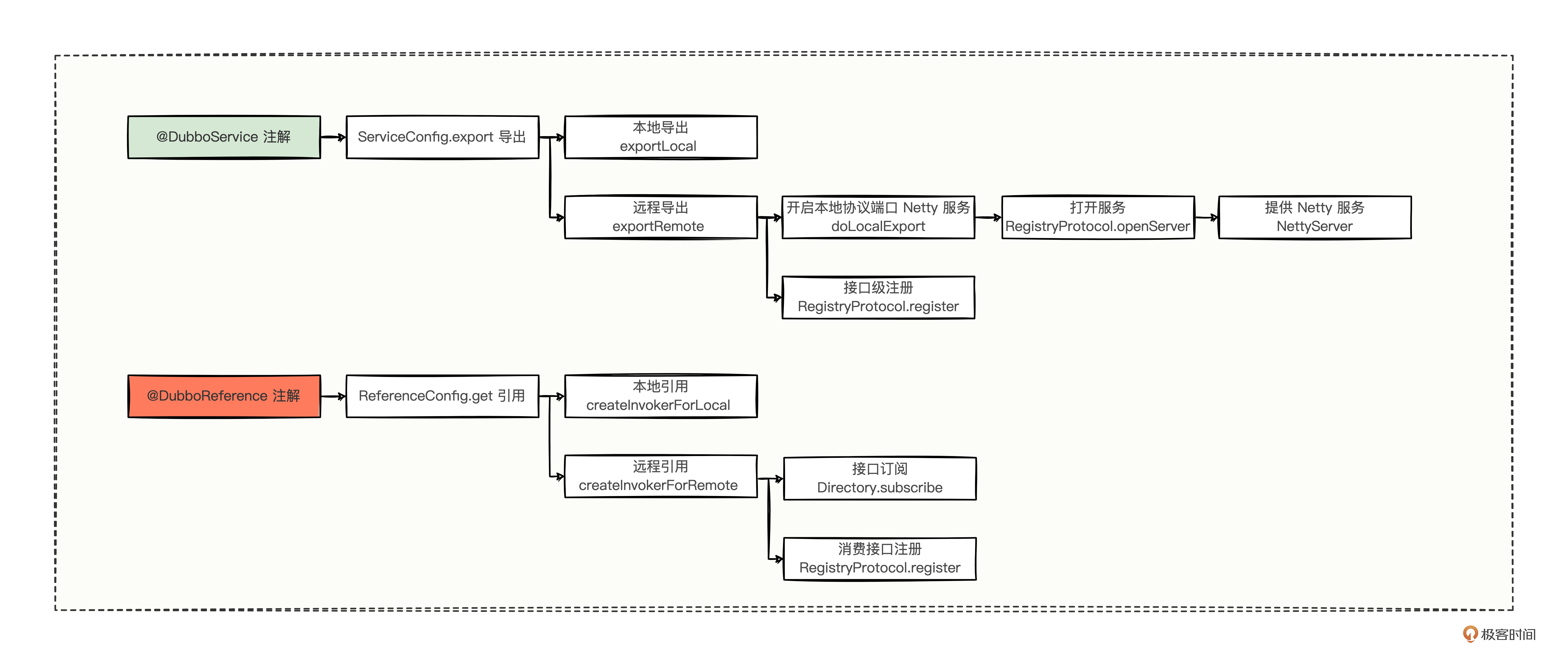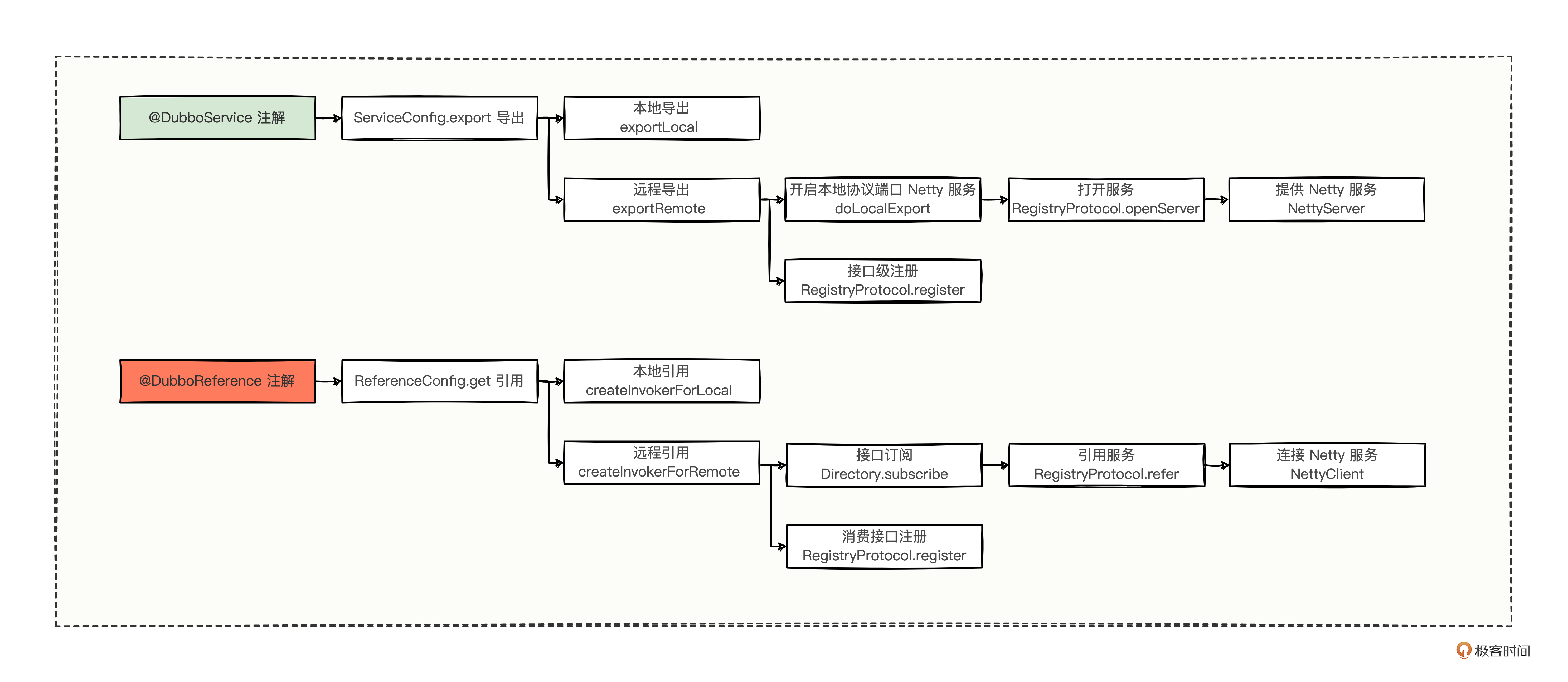 作用域,@DubboService 是作用于提供方的,而 @DubboReference 是作用于消费方的; 类的名称,@DubboService 会落到 ServiceConfig 中进行导出,而 @DubboReference 会落到 ReferenceConfig 中进行引用; 辐射功能,ServiceConfig 中涵盖了本地导出和远程导出两个重要的分支逻辑,但是 ReferenceConfig 还暂时不清楚。 有没有发现,这些小知识点你都学过。学知识,越比较,越能发现问题,然后在逐步解答问题的过程中,你会发现各个知识点已经融入了你的知识体系中。