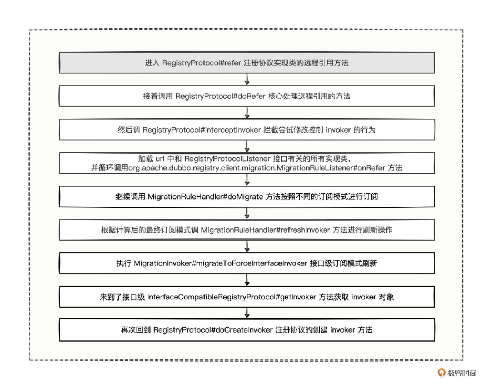 远程引用的 urls 集合,既可以是注册中心地址,也可以多个提供方的点对点地址。 不管 urls 集合的数量是一个还是多个,最终都是循环调用 refer 方法,然后累加 refer 的所有结果,最终被集群扩展器包装成了一个 invoker。 refer 的方法体中将注册器、集群扩展器、接口等信息全部封装到了一个 doRefer 方法中。 第三点,所有抽象的对象都传入了 doRefer 方法中,由此可见,这个方法应该就是我们研究的重中之重。我也给你总结了代码的调用流程图。