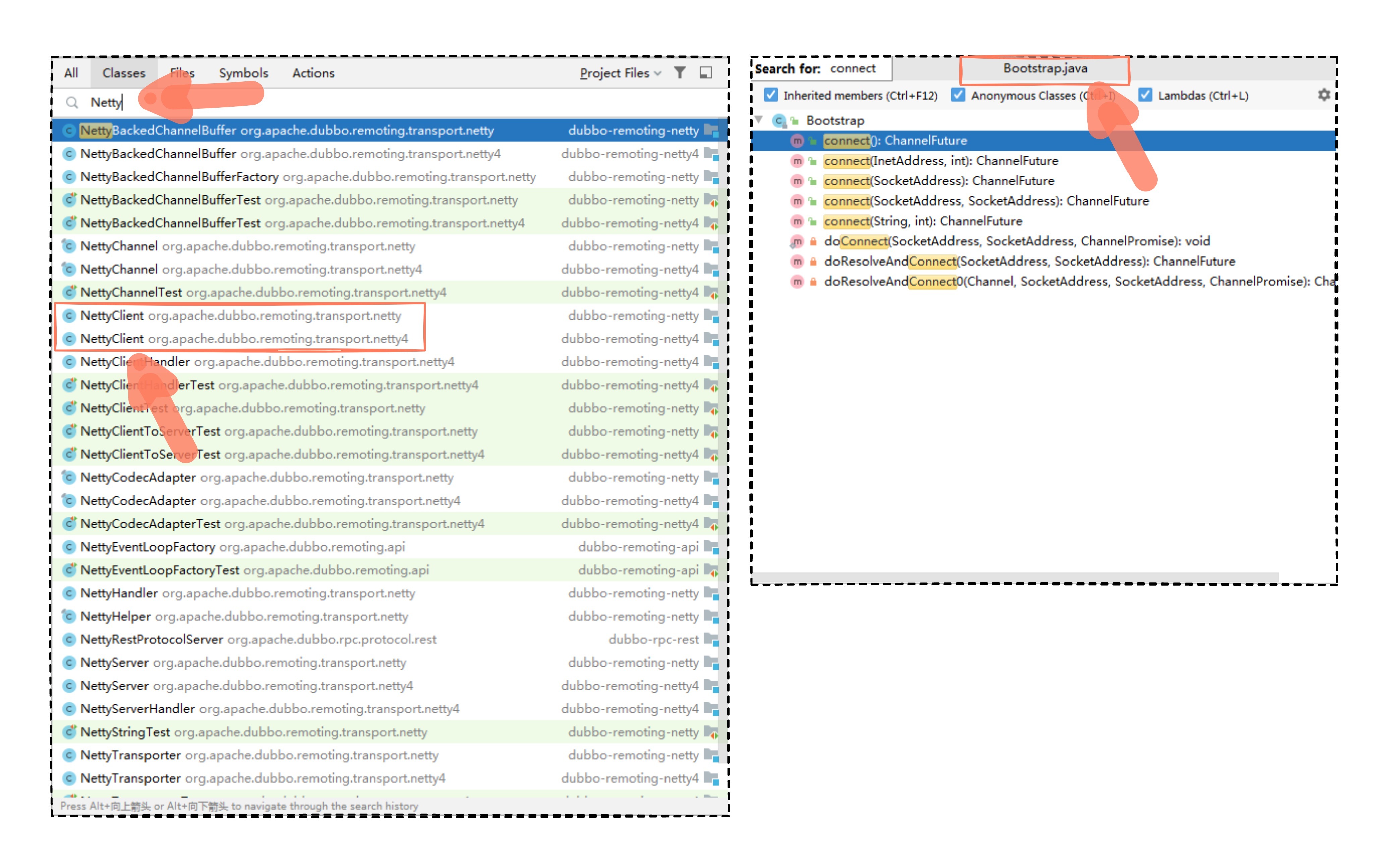 按照小技巧,我们输入了 Netty 关键字,看看有没有操作 Netty 的客户端类,又或者去 Netty 的 Bootstrap 类中看看有没有 connect 连接之类的方法,检索的结果展示如下:
