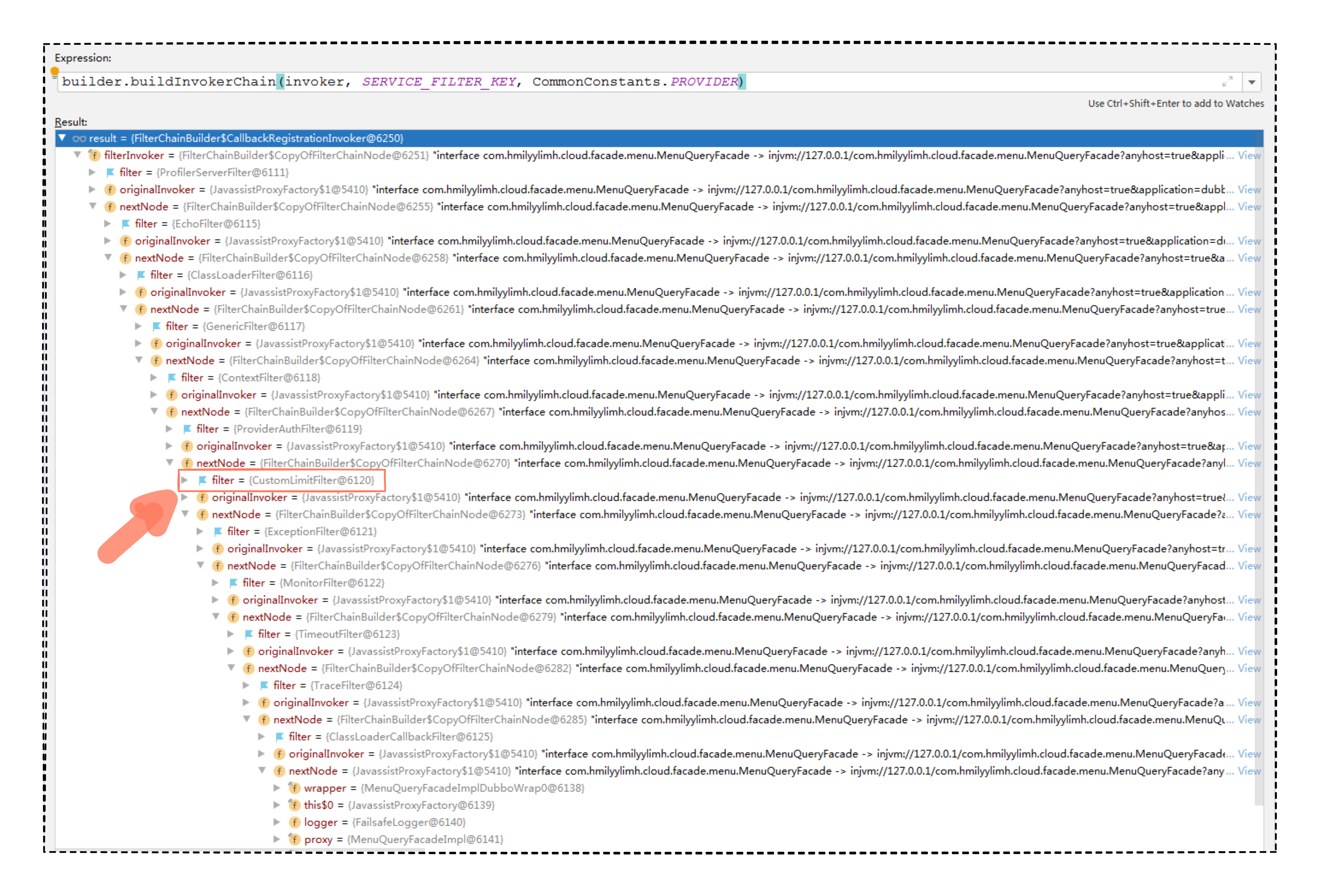 分支二的逻辑,为什么会有这么多的过滤器,是干什么用的呢?还记得在“[缓存操作]”“[参数验证]”“[流量控制]”几讲中提过的 Filter 过滤器么,其实就是在分支二这个环节加载进去的,不信的话,我们就挑“[流量控制]”的代码,断点查看一下 buildInvokerChain 的返参数据就知道了。