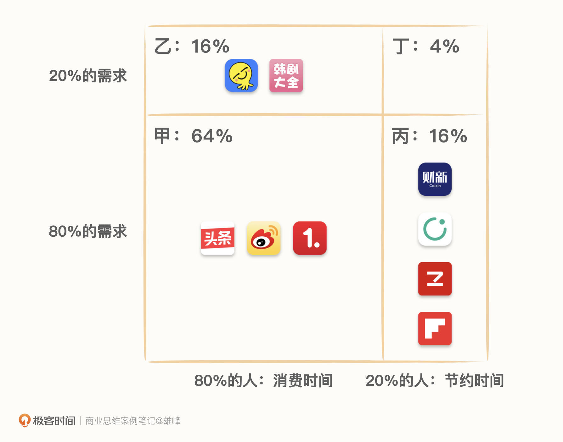 **丙:**20%用户的80%需求,**小众用户的刚性需求。**小众用户对内容则是投资的态度,因此会更偏向深度、严肃等高质量内容。比如财新、知识星球、Flipboard或者极客时间。