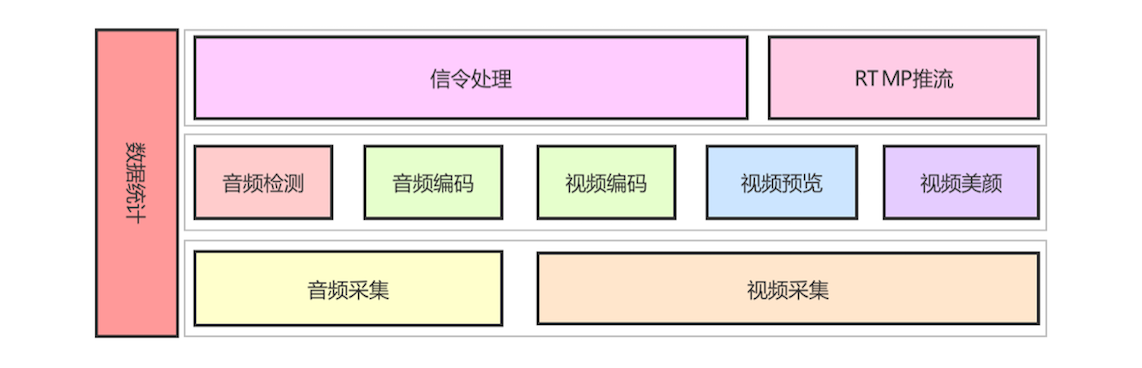 采集层,包括音频采集和视频采集。这两个功能模块非常简单,一个用于采集音频数据,另一个用于采集视频数据。它们都是与硬件打交道。