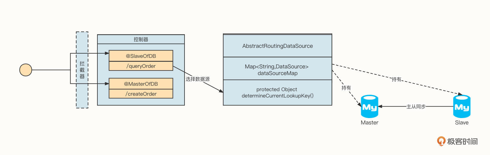 第二,当用户发起请求时,要先经过一个拦截器获取用户请求的具体接口,然后使用反射机制获取该方法上的注解。举个例子,如果存在@SlaveofDB,则往线程上下文环境中存储一个名为dbType的变量,赋值为slave,表示走从库;如果存在@MasterOfDB,则存储为master,表示走主库。