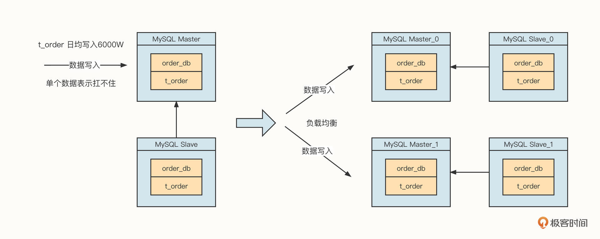 简单说明一下。分库分表主要是通过引入多个写入节点来缓解数据压力的。因此,在接受写入请求后,负载均衡算法会将数据路由到其中一个节点上,多个节点共同分担数据写入请求,降低单个节点的压力,提升扩展性,解决单节点的性能瓶颈。