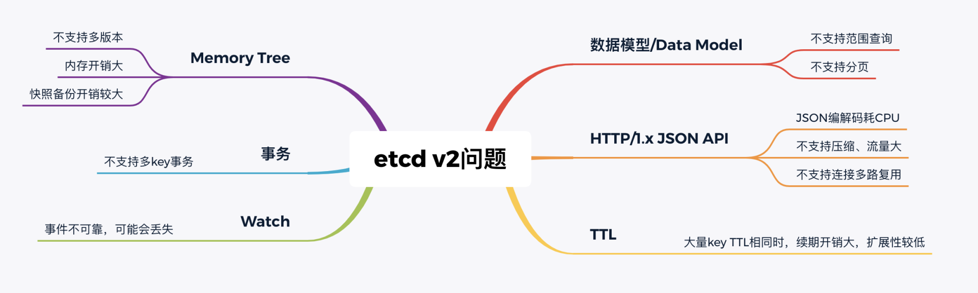 下面我分别从功能局限性、Watch事件的可靠性、性能、内存开销来分别给你剖析etcd v2的问题。