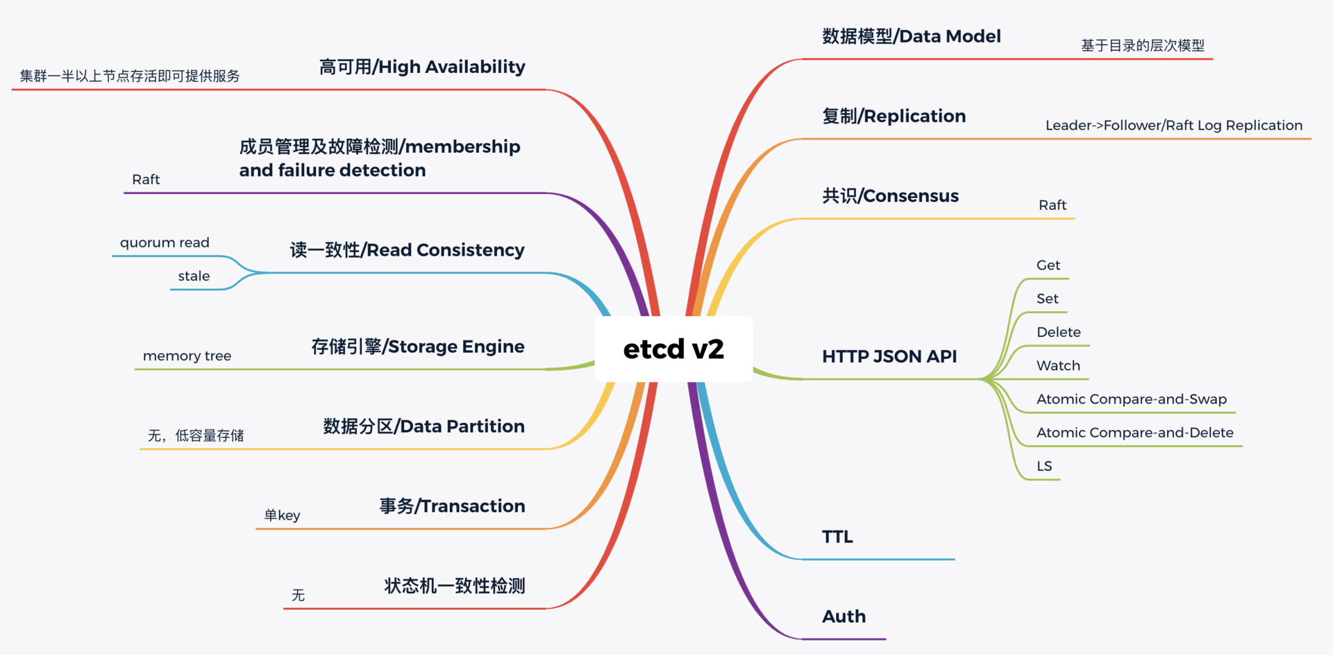 下图我从构建分布式系统的核心要素角度,给你总结了etcd v2核心技术点。无论是NoSQL存储还是SQL存储、文档存储,其实大家要解决的问题都是类似的,基本就是图中总结的数据模型、复制、共识算法、API、事务、一致性、成员故障检测等方面。