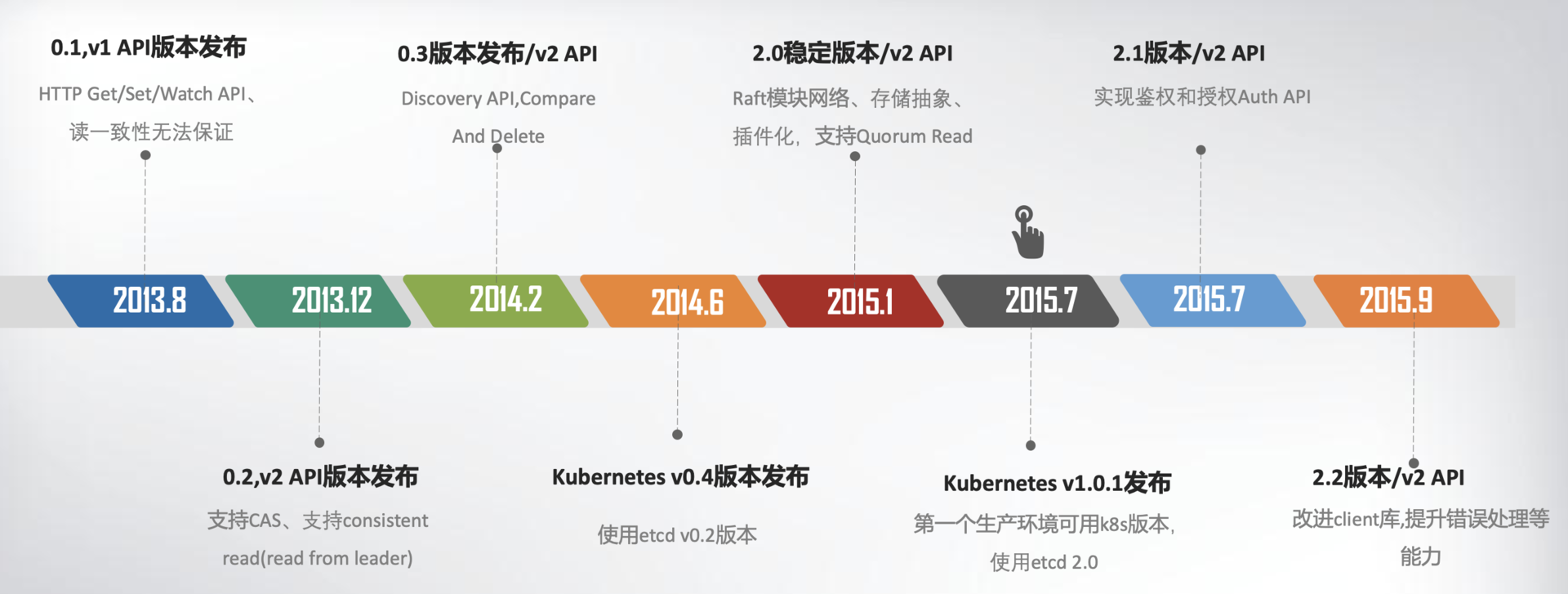 在2015年1月,CoreOS发布了etcd第一个稳定版本2.0,支持了quorum read,提供了严格的线性一致性读能力。7月,基于etcd 2.0的Kubernetes第一个生产环境可用版本v1.0.1发布了,Kubernetes开始了新的里程碑的发展。
