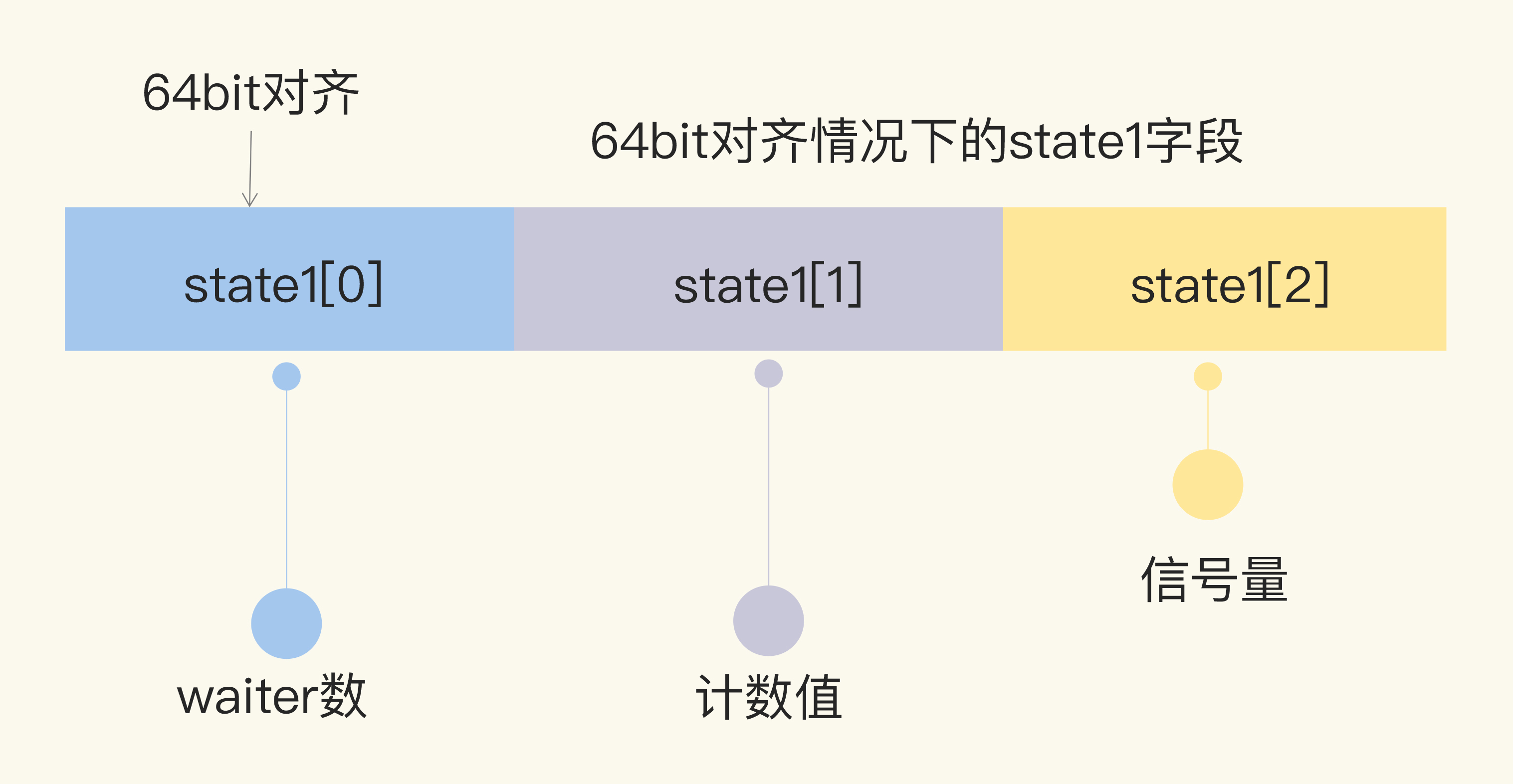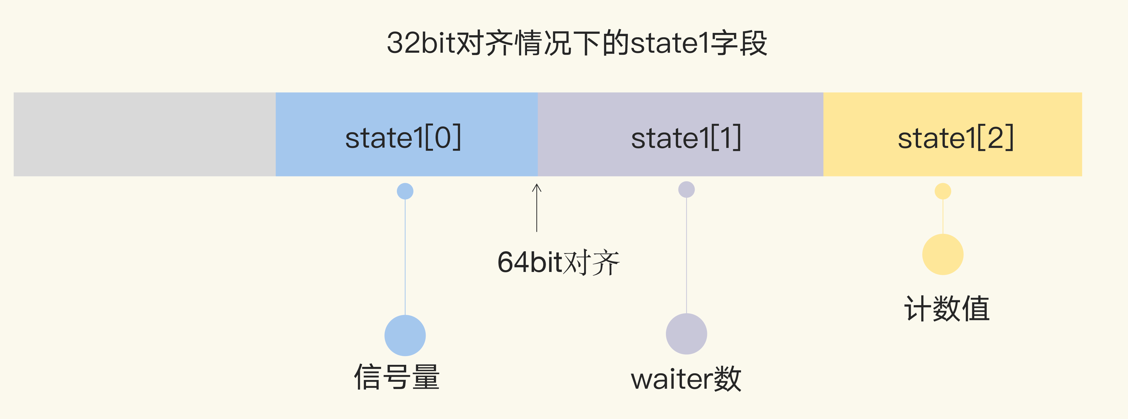 在32位环境下,如果state1不是64位对齐的地址,那么state1的第一个元素是信号量,后两个元素分别是waiter数和计数值。