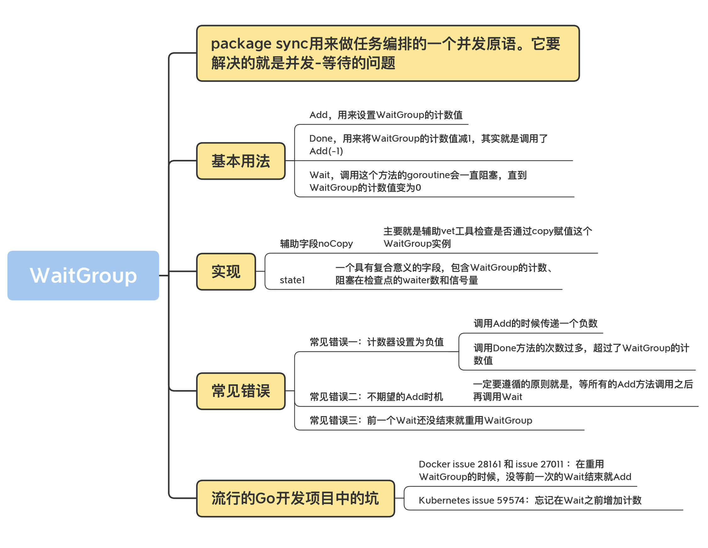 这一讲我们详细学习了WaitGroup的相关知识,这里我整理了一份关于WaitGroup的知识地图,方便你复习。