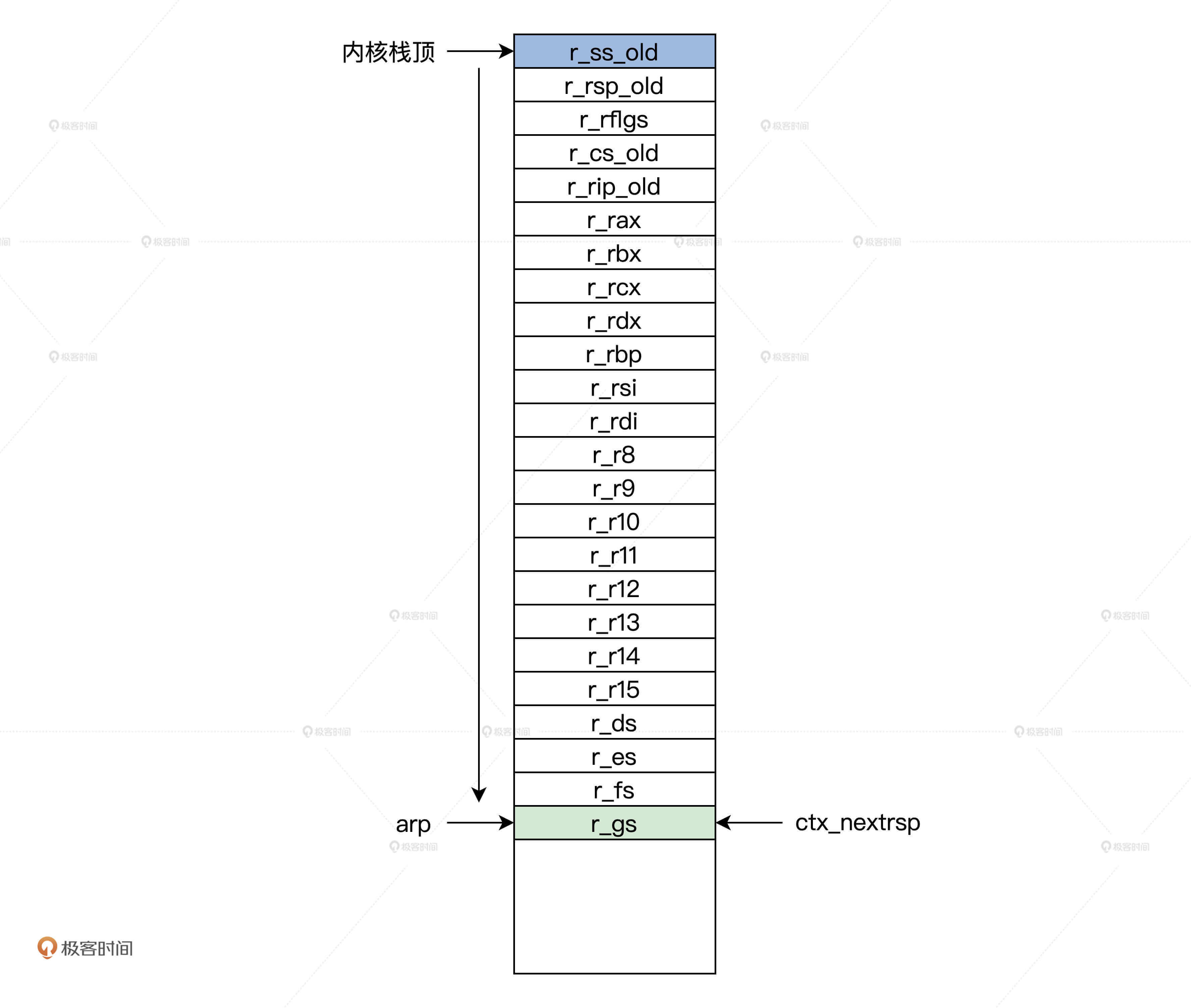 上述代码没什么难点,就是第7行我要给你解释一下,arp为什么要用内核栈顶地址减去intstkregs_t结构的大小呢?