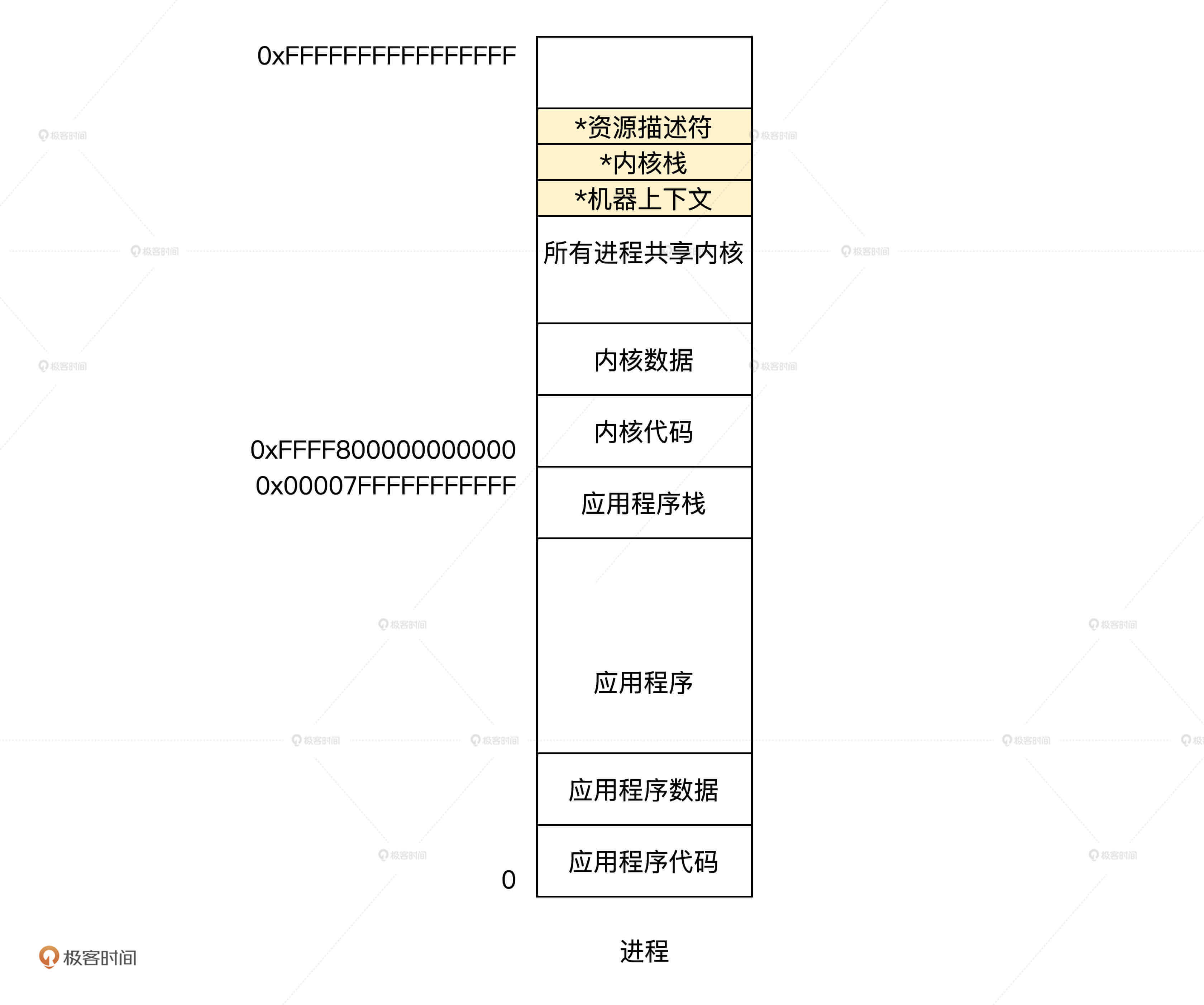 所以,从这两个角度看,进程必须要有一个地址空间,这个地址空间至少包括两部分内容:一部分是内核,一部分是用户的应用程序。