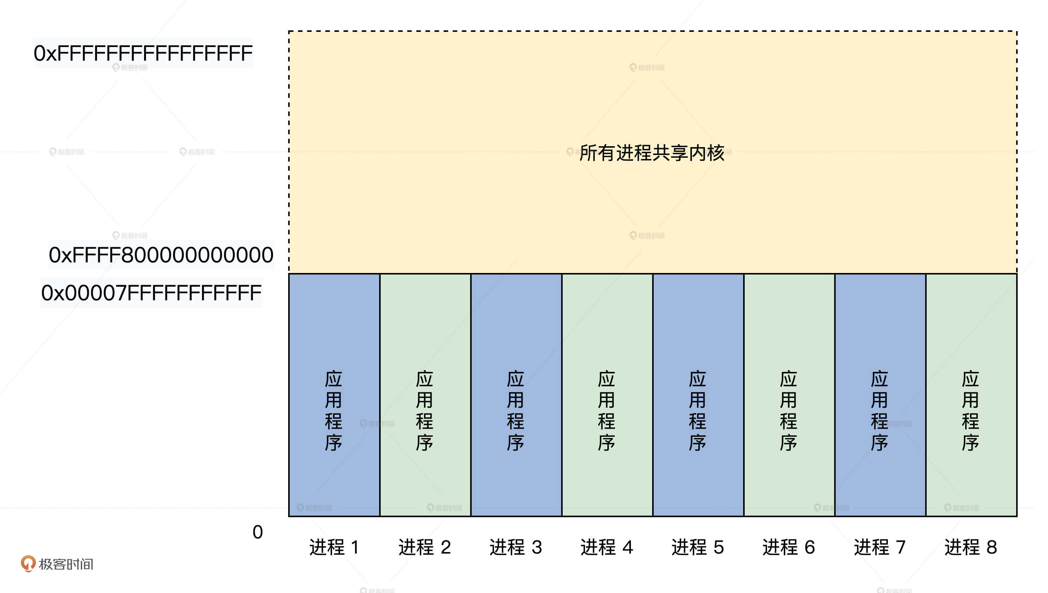 上图中有8个进程,每个进程拥有x86 CPU的整个虚拟地址空间,这个虚拟地址空间被分成了两个部分,上半部分是所有进程都共享的内核部分 ,里面放着一份内核代码和数据,下半部分是应用程序,分别独立,互不干扰。