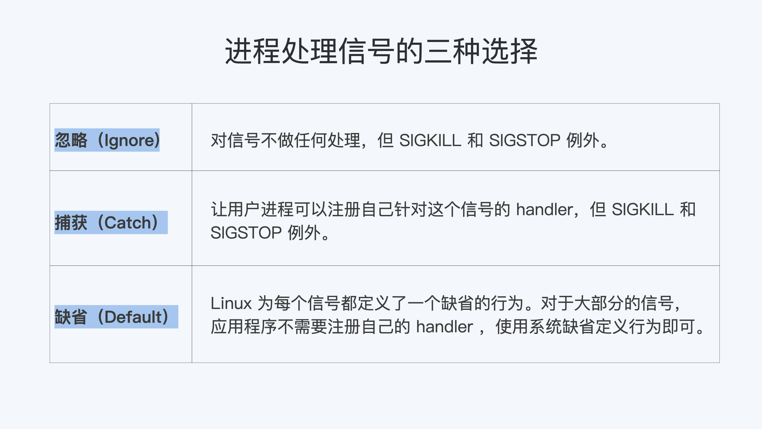还有一个选择是缺省行为(Default),Linux为每个信号都定义了一个缺省的行为,你可以在Linux系统中运行 man 7 signal来查看每个信号的缺省行为。
