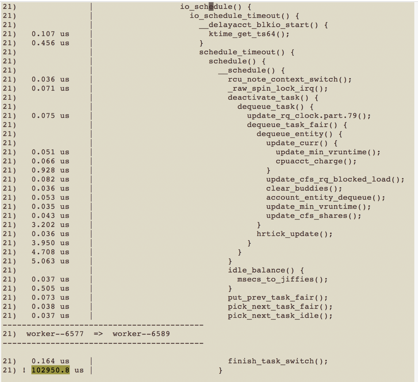 我们可以发现pread(2)有102ms是阻塞在io_schedule()这个函数里的,io_schedule()的意思是,该线程因I/O阻塞而被调度走,线程需要等待I/O完成才能继续执行。在function_graph里,我们同样也能看到pread(2**)**是如何一步步执行到io_schedule的,由于整个流程比较长,我在这里只把关键的调用逻辑贴出来: