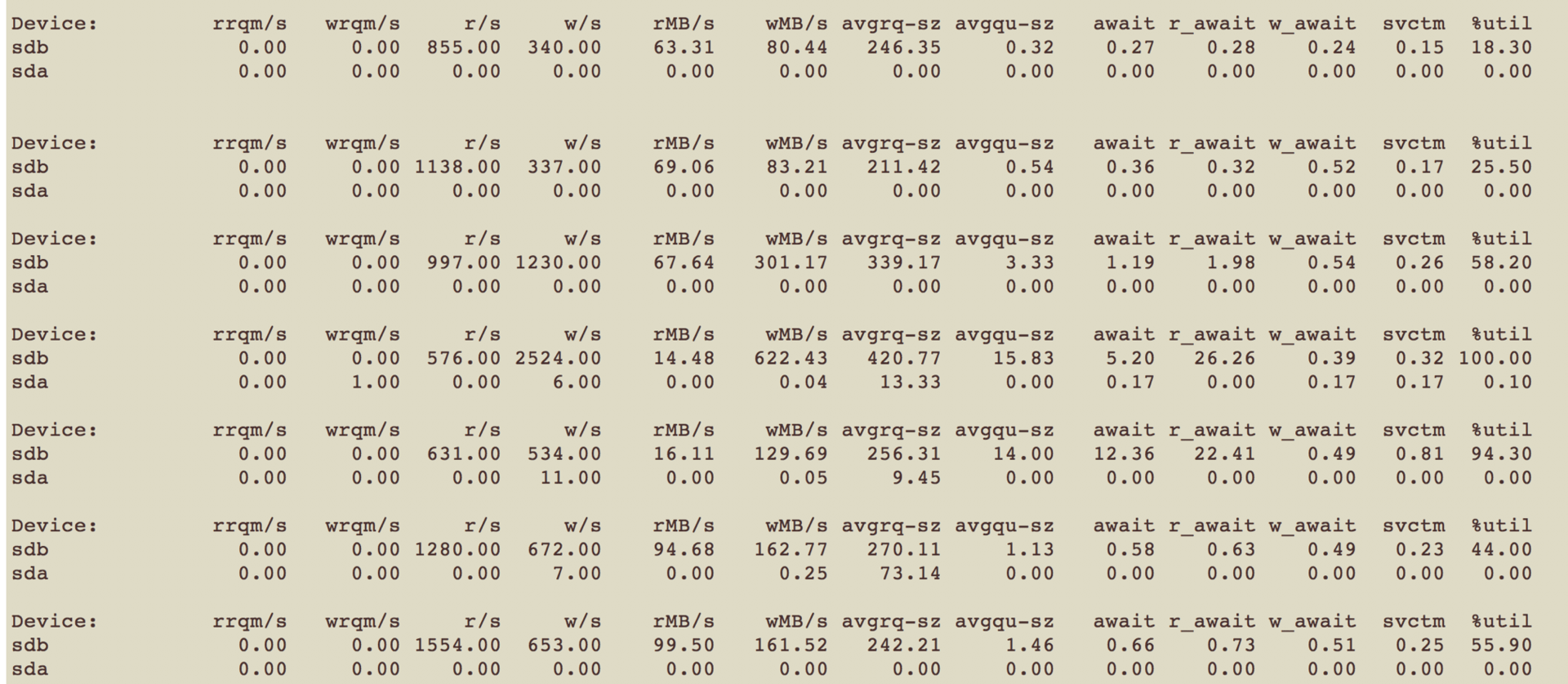 因为线程是阻塞在磁盘I/O里的,所以我们需要查看一下系统的磁盘I/O情况,我们可以使用iostat来观察: