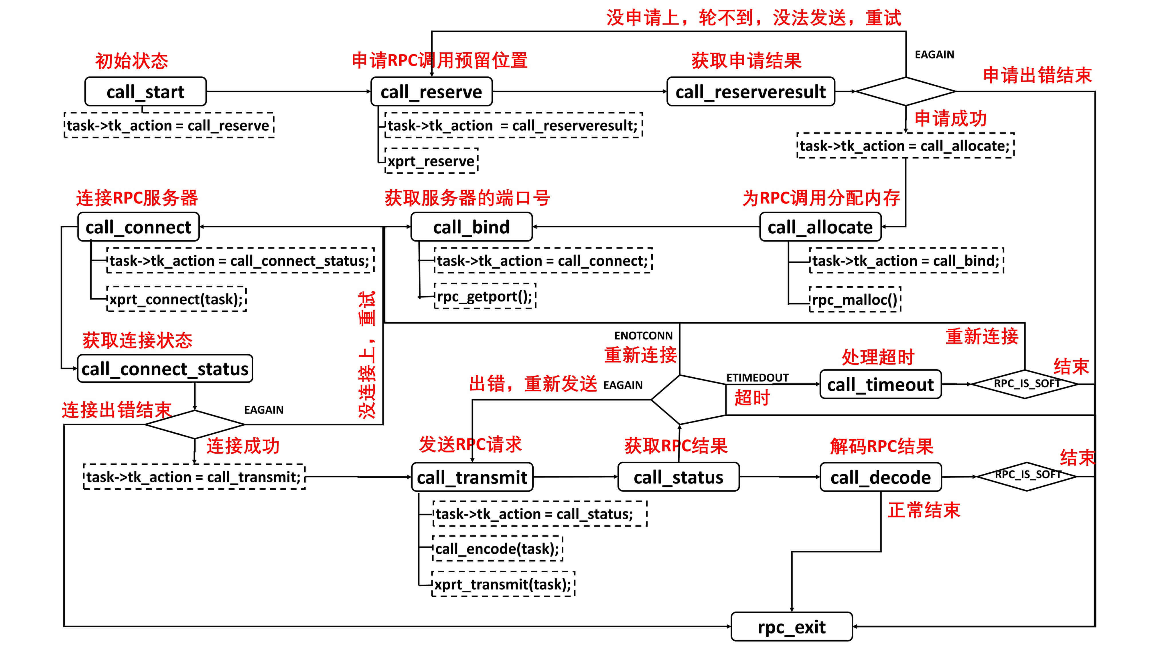 首先,进入起始状态,查看RPC的传输层队列中有没有空闲的位置,可以处理新的RPC任务。如果没有,说明太忙了,或直接结束或重试。如果申请成功,就可以分配内存,获取服务的端口号,然后连接服务器。
