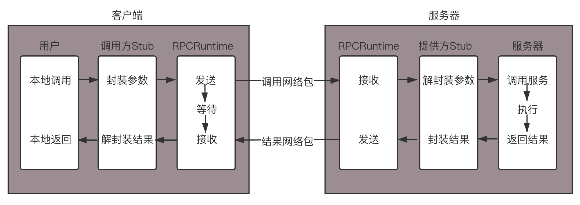 服务器端的RPCRuntime收到请求后,交给提供方Stub进行解码,然后调用服务端的方法,服务端执行方法,返回结果,提供方Stub将返回结果编码后,发送给客户端,客户端的RPCRuntime收到结果,发给调用方Stub解码得到结果,返回给客户端。