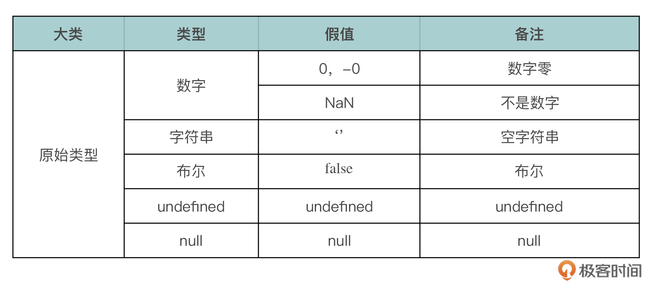 这里你一定会问,**那么真值有哪些呢?**其实你可以使用排除法,除了假值以外的,都可以认为是真值。为了方便查询,你可以参考下面这个列表。