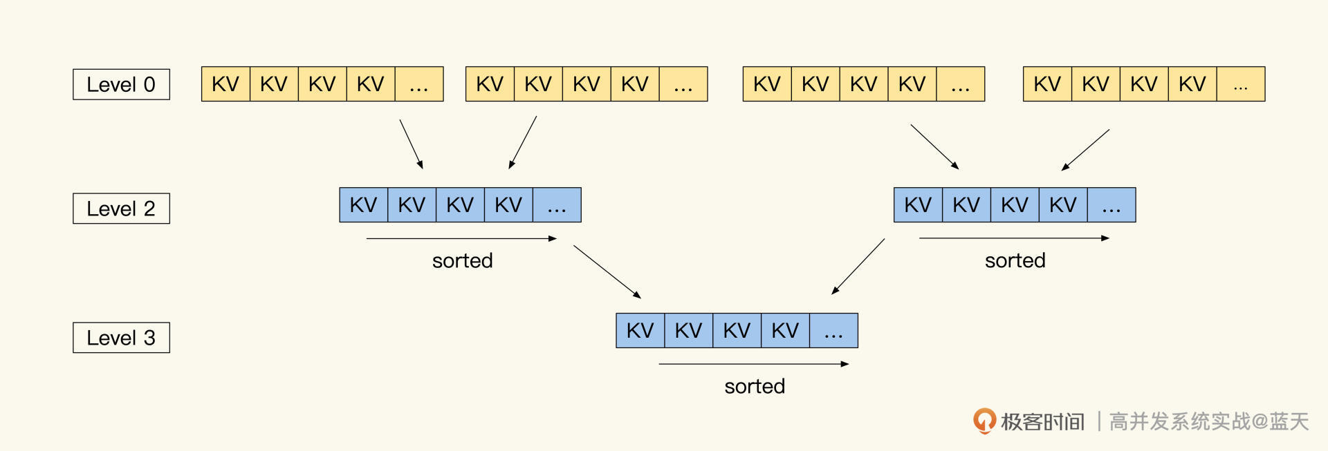 每一层的数据块和数据量超过一定程度时,RocksDB合并不同Level的数据,将多个数据块内的数据和索引合并在一起,并推送到Level的下一层。通过这个方式,每一层的数据块个数和数据量就能保持一定的数量,合并后的数据会更紧密、更容易被找到。