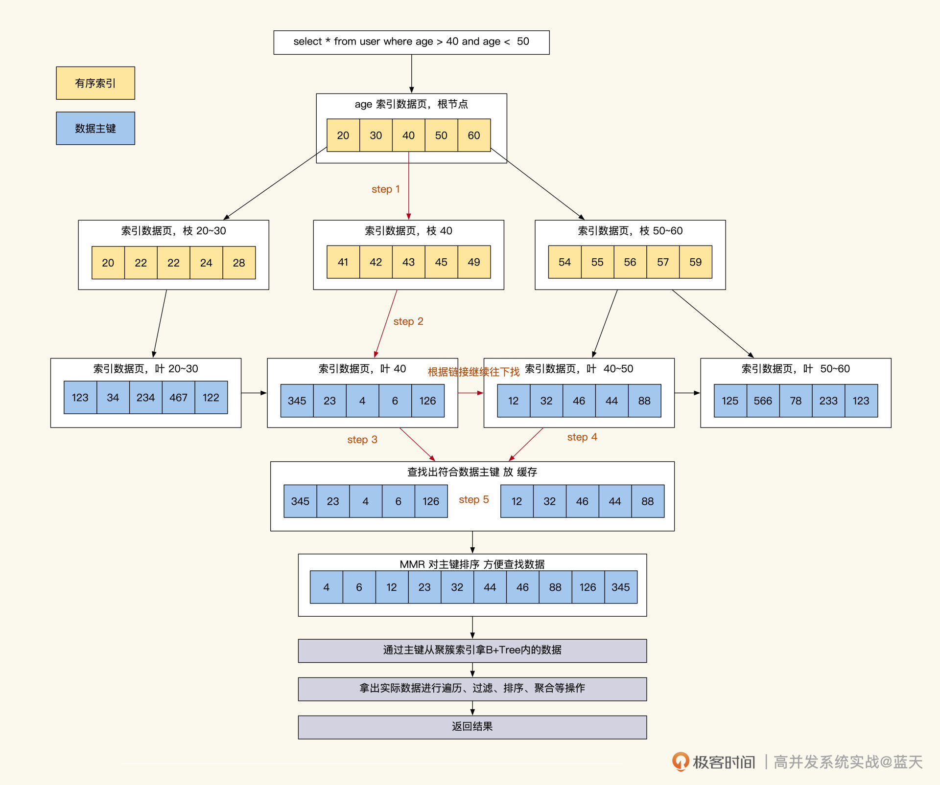 通过上面的讲解,相信你已经对整个查询有画面感了:当我们查询时,通过1~3次IO查找辅助索引,从而找到一批数据主键ID。然后,通过MySQL的MMR算法将这些ID做排序,再回表去聚簇索引按取值范围提取在子叶上的业务数据,将这些数据边取边算或一起取出再进行聚合排序后,之后再返回结果。
