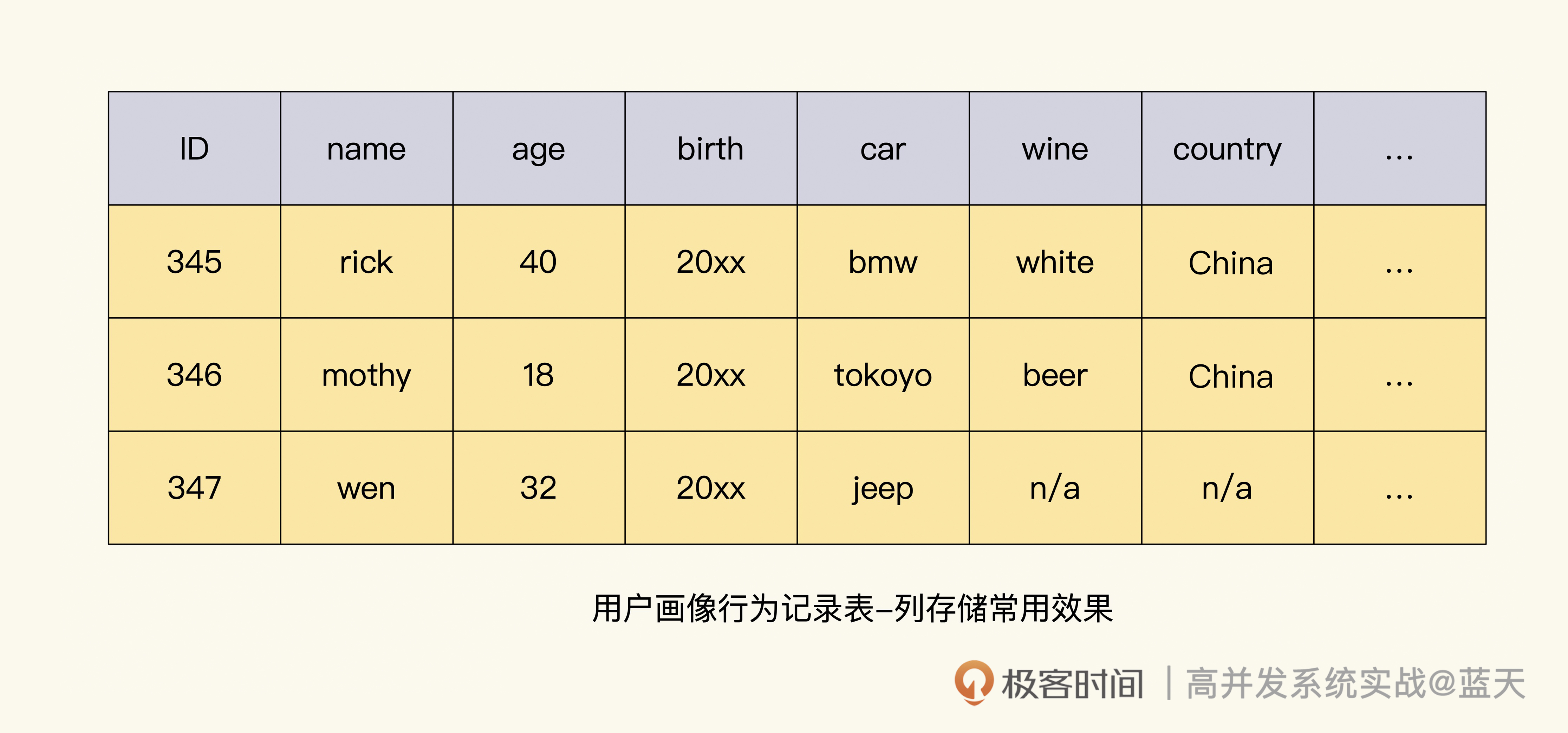 但是,实时数据分析则相反,很多情况下常用一行表示一个用户或主要实体(聚合根),而列保存这个用户或主要实体是否买过某物、使用过什么App、去过哪里、开什么车、点过什么食品、哪里人等等。