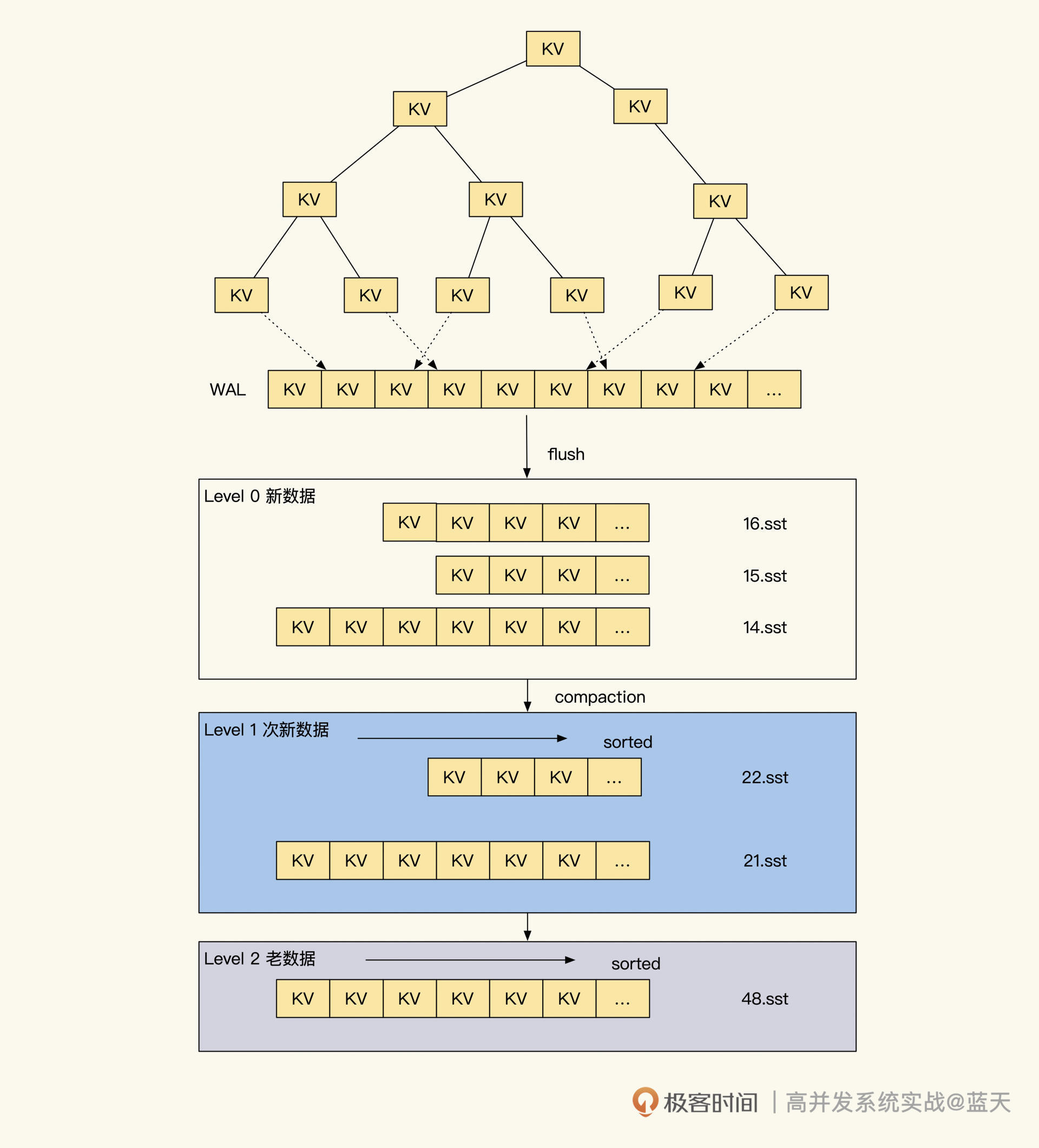 RocksDB LSM则不同,它是由一棵棵小树组成,当我们新数据写入时会在内存中暂存,这样能够获得非常大的写并发处理能力。而当内存中数据积累到一定程度后,会将内存中数据和索引做顺序写,落地形成一个数据块。