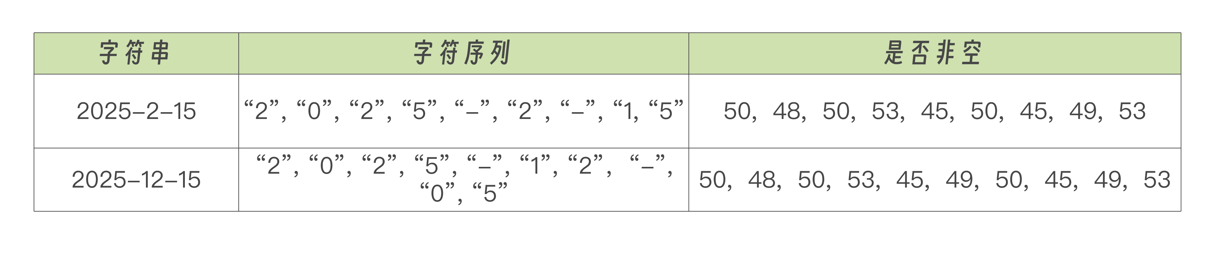 按字典序的规则,它比较的是字符串中字符的 ASCII 值,从左到右逐个比较,直到找到不同的字符为止。如果两个字符串的前几个字符都相同,就比较下一个字符。最终结果是基于这些字符的 ASCII 值的大小顺序,而不是实际日期的自然顺序。比如表格里的例子,第六个字符开始不同,49小于50,所以“2025-12-15”会排到“2025-2-15”之前。