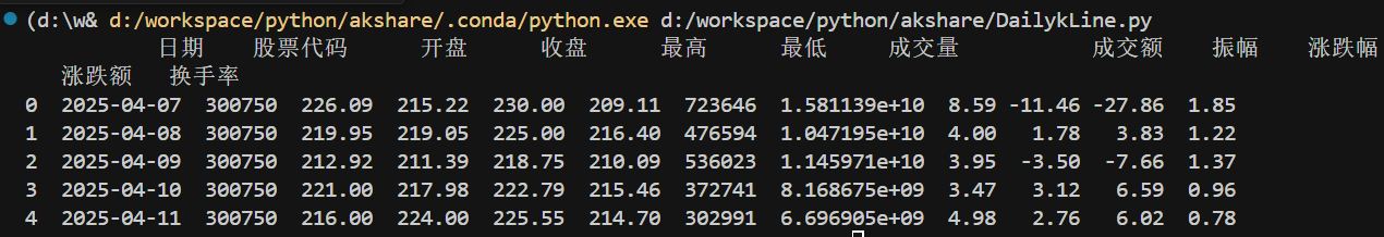 这里我的 adjust 使用的是 qwq,表示前复权。调用 stock_zh_a_hist 方法后得到的 df 是一个 pandas 中的 dataframe。pandas 是一个 python 的数据分析包,专门用于高效处理结构化数据(如表格、时间序列等),一般在数据科学、机器学习和数据分析领域会经常用到。而 dataframe 则是 pandas 中的一个数据结构,是一个二维表格,类似 excel。