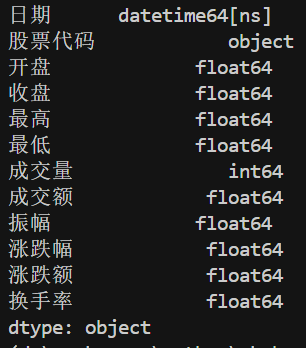 这几行代码运行后,可能会有问题,也可能没有。这是为什么呢?要解释这个问题,我们需要先来打印一下上文股票数据中日期的类型,代码如下:
