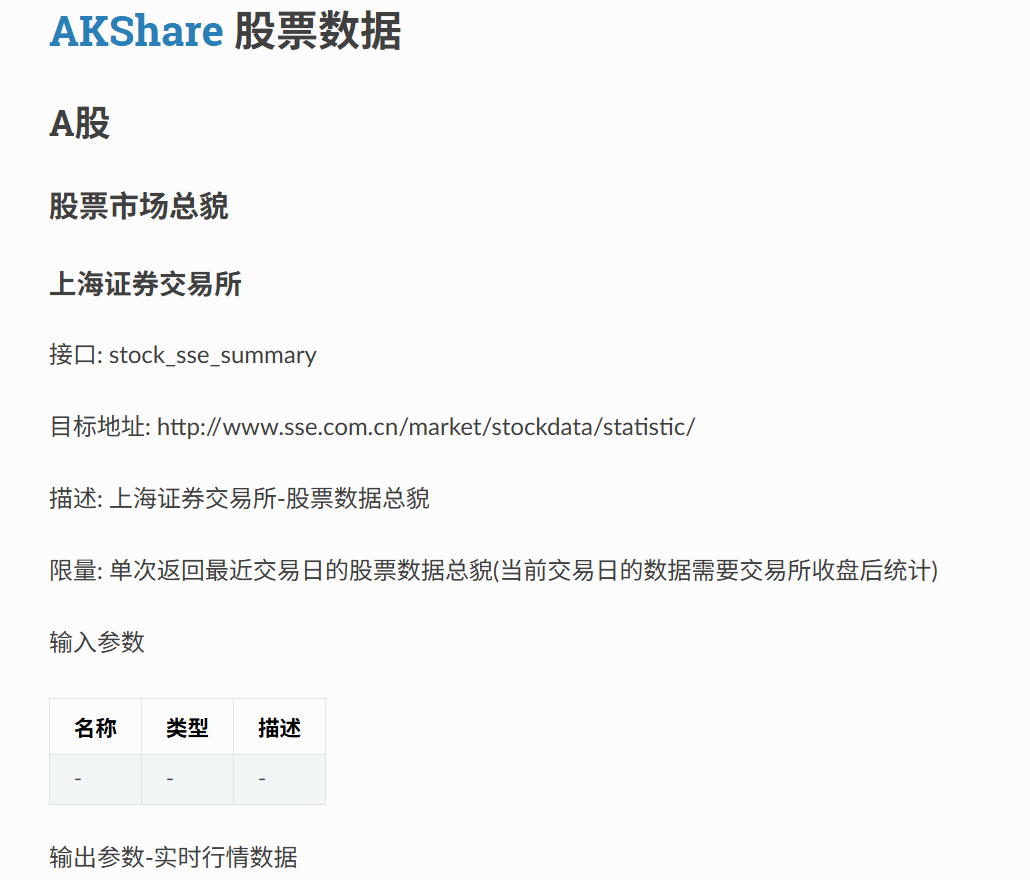 安装完成后,再看数据字典文档,可以看到 AKShare 支持多种类型的金融数据的抓取。