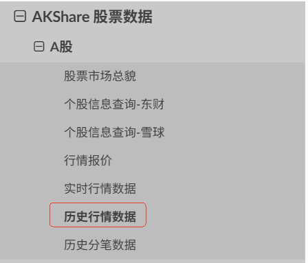 如下图所示,点击文档的 A 股 -> 历史行情数据。