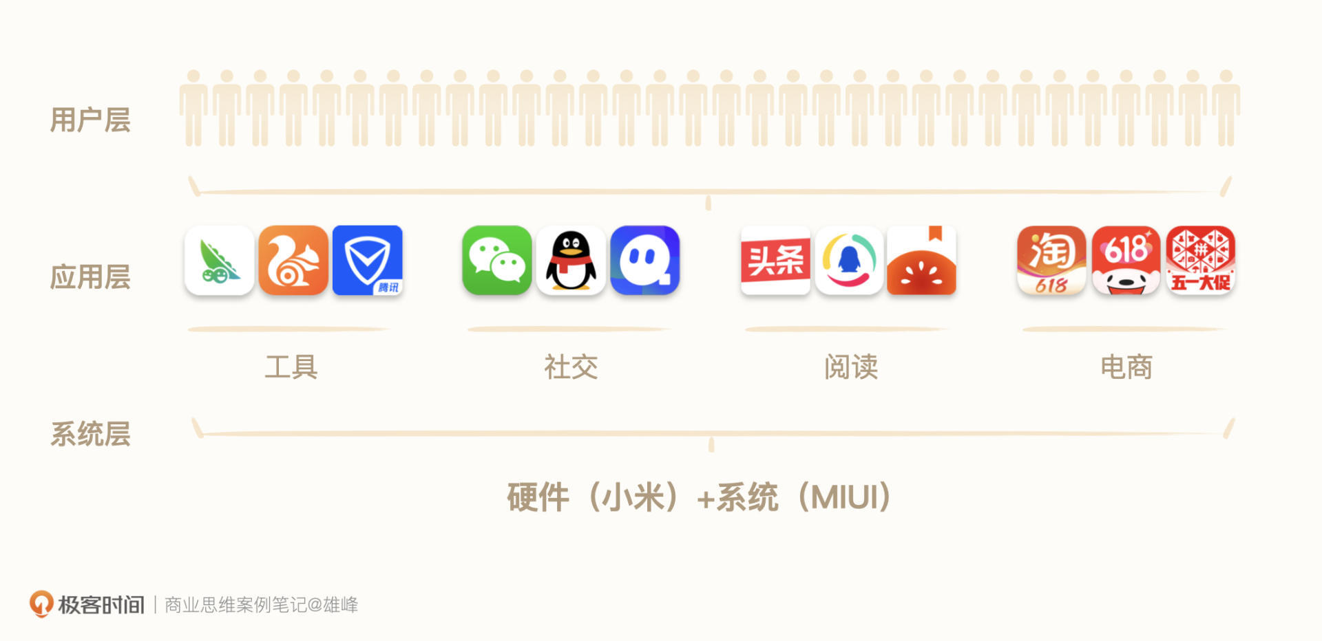 在手机厂商眼中,整个系统运作是一个三层结构:最上面是用户层,中间是应用层,最下面是系统底层。系统并不直接服务于用户,而是通过各种App来服务用户,因此收入都被App所获取。