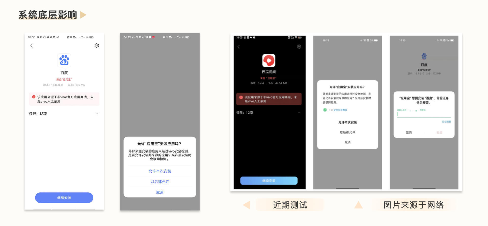 第三步,系统底层影响:如果用户还是希望下载第三方产品呢?那么这个时候,就可以通过系统底层收口,提供比第三方更好的体验,或者让第三方体验变差。什么叫让第三方体验变差呢?比如用应用宝或者豌豆荚下载应用,则会被导流到厂商自身的官方商店当中,如果用户坚持用第三方商店下载应用,则需要经过一系列繁琐的操作才可以实现。