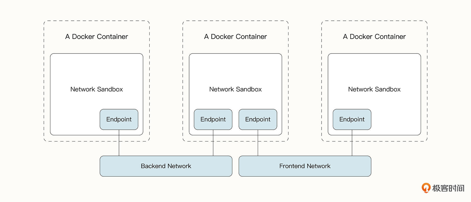那Docker网络通信的原理是什么呢?我们在之前看到,容器中的网络是相互隔离的,容器与容器之间无法相互通信。在Linux中,这是通过网络命名空间(Network namespace)实现的隔离。Docker中的网络模型遵循了容器网络模型(CNM,Container Network Model)的设计规范。如下所示,容器网络就像一个沙盒,只有通过Endpoint将容器加入到指定的网络中才可以相互通信。