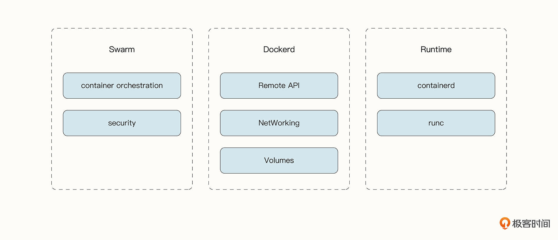 当前Docker的架构可以分为4个部分,分别为运行时(Runtime)、守护进程(Dockerd) 、集群管理(Swarm)和客户端(Client)。