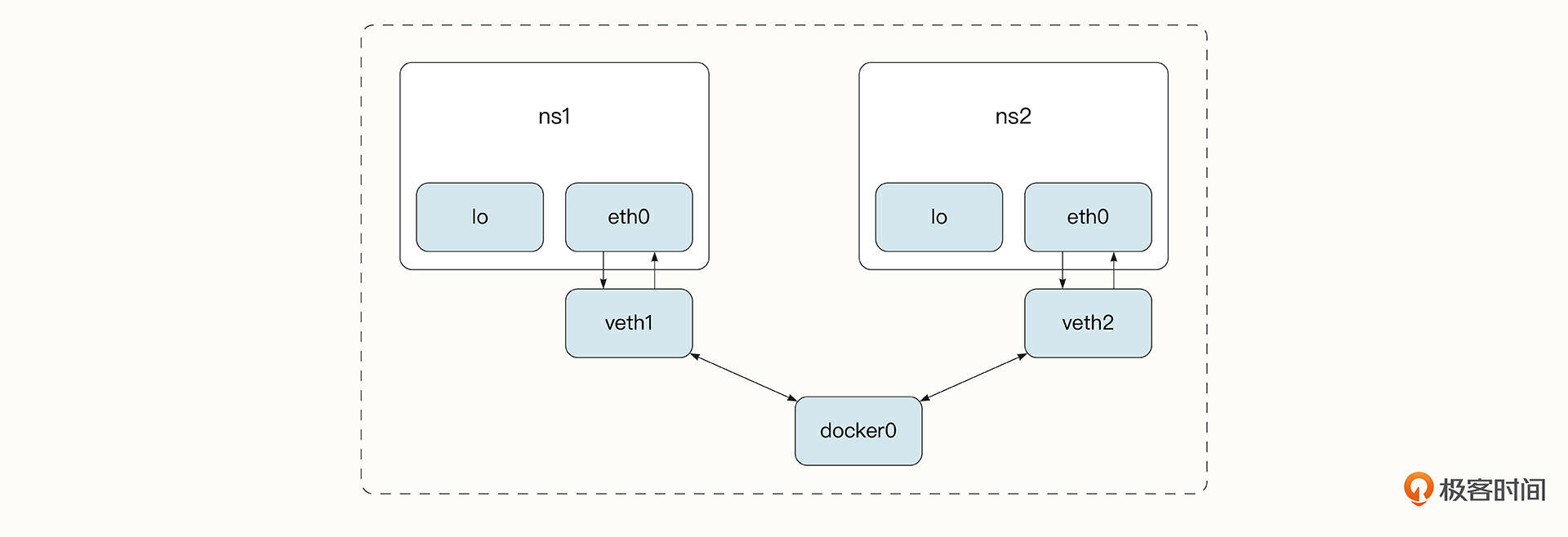 以Linux系统为例,Docker 会在宿主机和容器内分别创建一个虚拟接口(这样的一对接口叫做 Veth Pair),虚拟接口的两端彼此连通,这就可以实现跨网络的命名空间通信了。