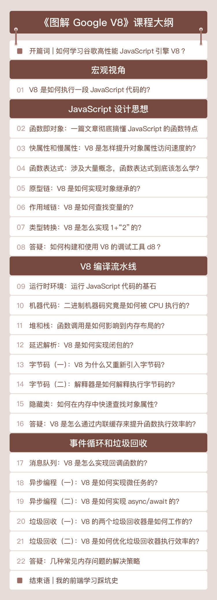 以上,就是系统学习V8的路径。在我们这一季的课程中,也会按照这样的思路来设计课程,来帮助你学习到V8的完整的知识体系。