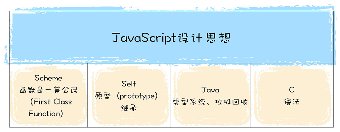 JavaScript借鉴了很多语言的特性,比如C语言的基本语法、Java的类型系统和内存管理、Scheme的函数作为一等公民,还有Self基于原型(prototype)的继承机制。毫无疑问,JavaScript是一门非常优秀的语言,特别是“原型继承机制”和“函数是一等公民”这两个设计。