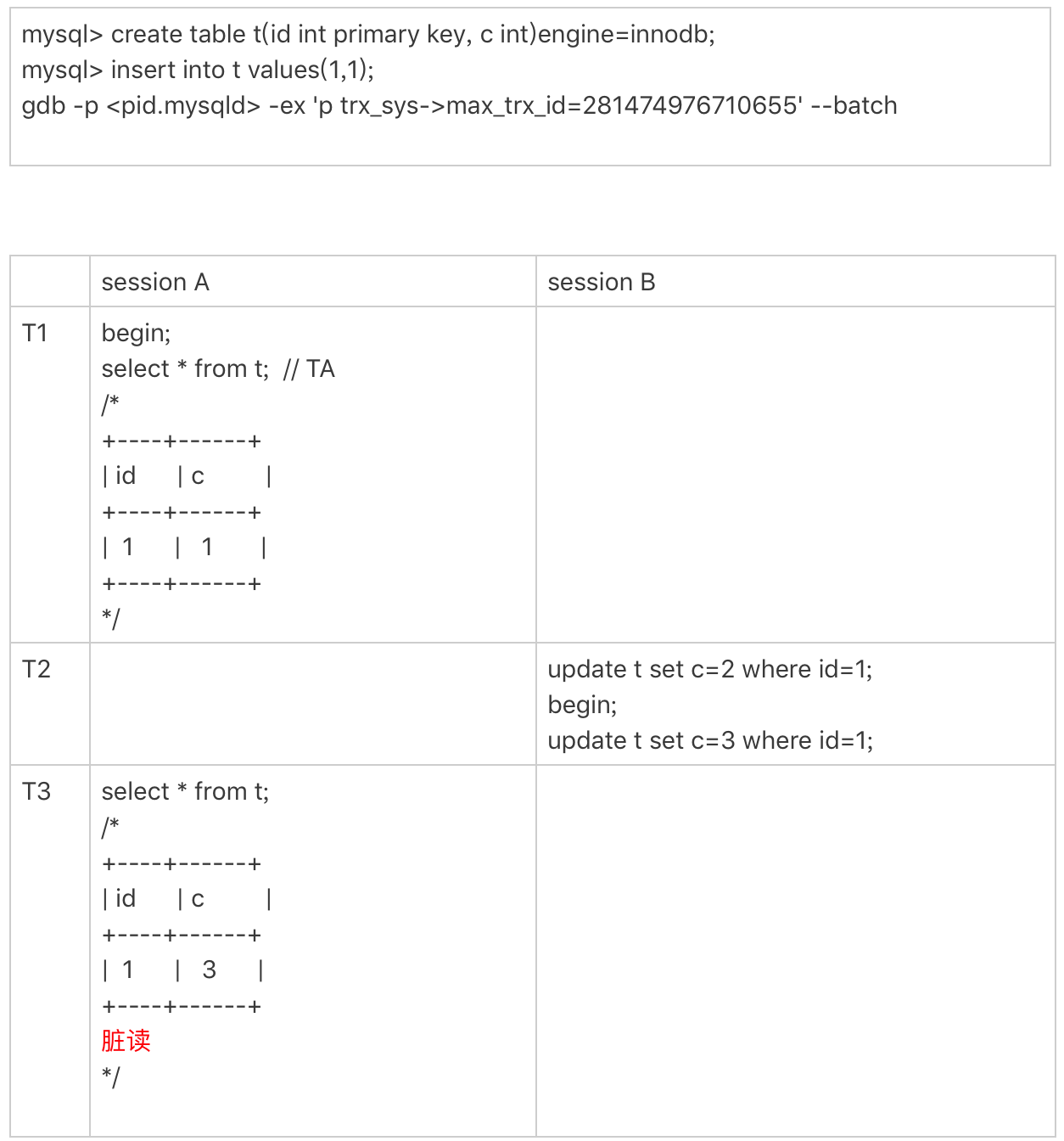 我在上一篇文章的末尾留给你的思考题,就是关于从innodb_trx表里面查到的trx_id的。现在,我们一起来看一个事务现场: