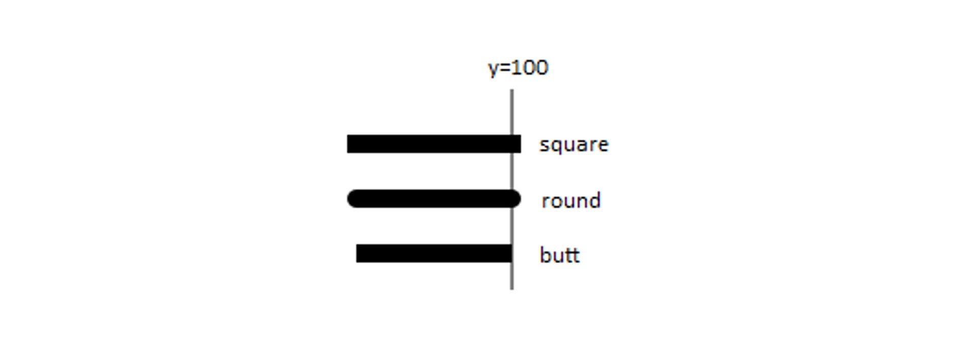 说完了lineJoin,那什么是lineCap呢?lineCap就是指曲线头尾部的形状,它有三种类型。第一种是square,方形线帽,它会在线段的头尾端延长线宽的一半。第二种round也叫圆弧线帽,它会在头尾端延长一个半圆。第三种是butt,就是不添加线帽。