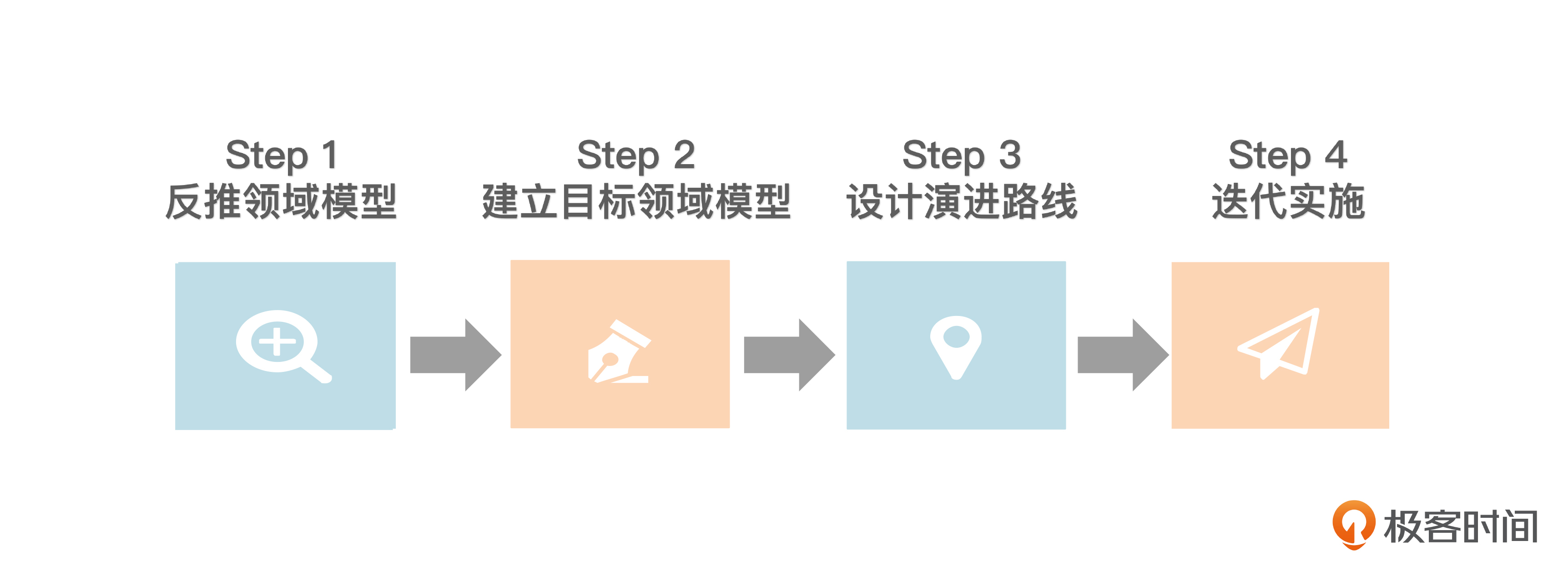 第三步是设计演进路线。有了当前模型和目标模型,就可以分析两者之间的差距。跨越这个差距的过程就是改进的过程。设计演进路线最大的问题就是怎么保证可行性。一般要把改进过程化整为零,迭代实施,并且还要兼顾日常的业务需求,后面我们还会提到这个问题。
