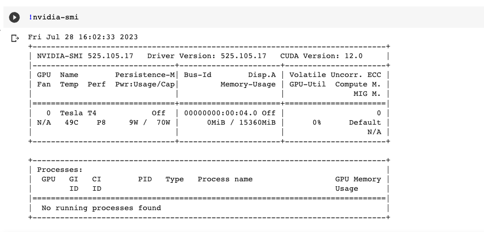 点击播放按钮,我们可以看到,我们“获得”了一张T4显卡,显存大小为15GB。这样一张显卡足够我们完成本课程中的各种运算。